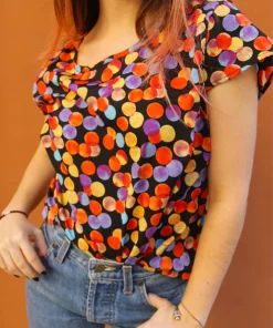Black Sleeveless Vest Top with Square Neckline and Multi Colour Print Trim