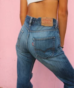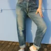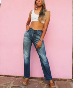 Vintage Levi’s 501 jeans in a blue denim with ripped area to front.