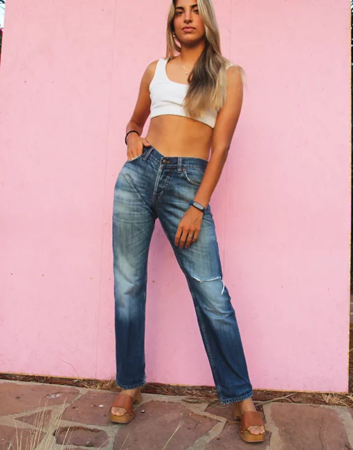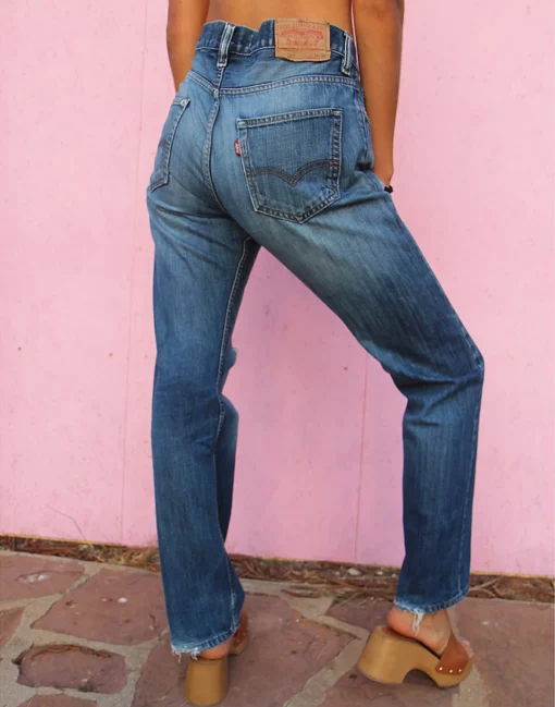 Vintage Levi’s 501 jeans in a blue denim with ripped area to front.
