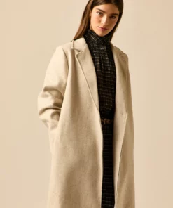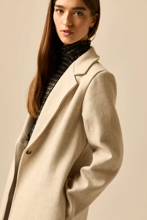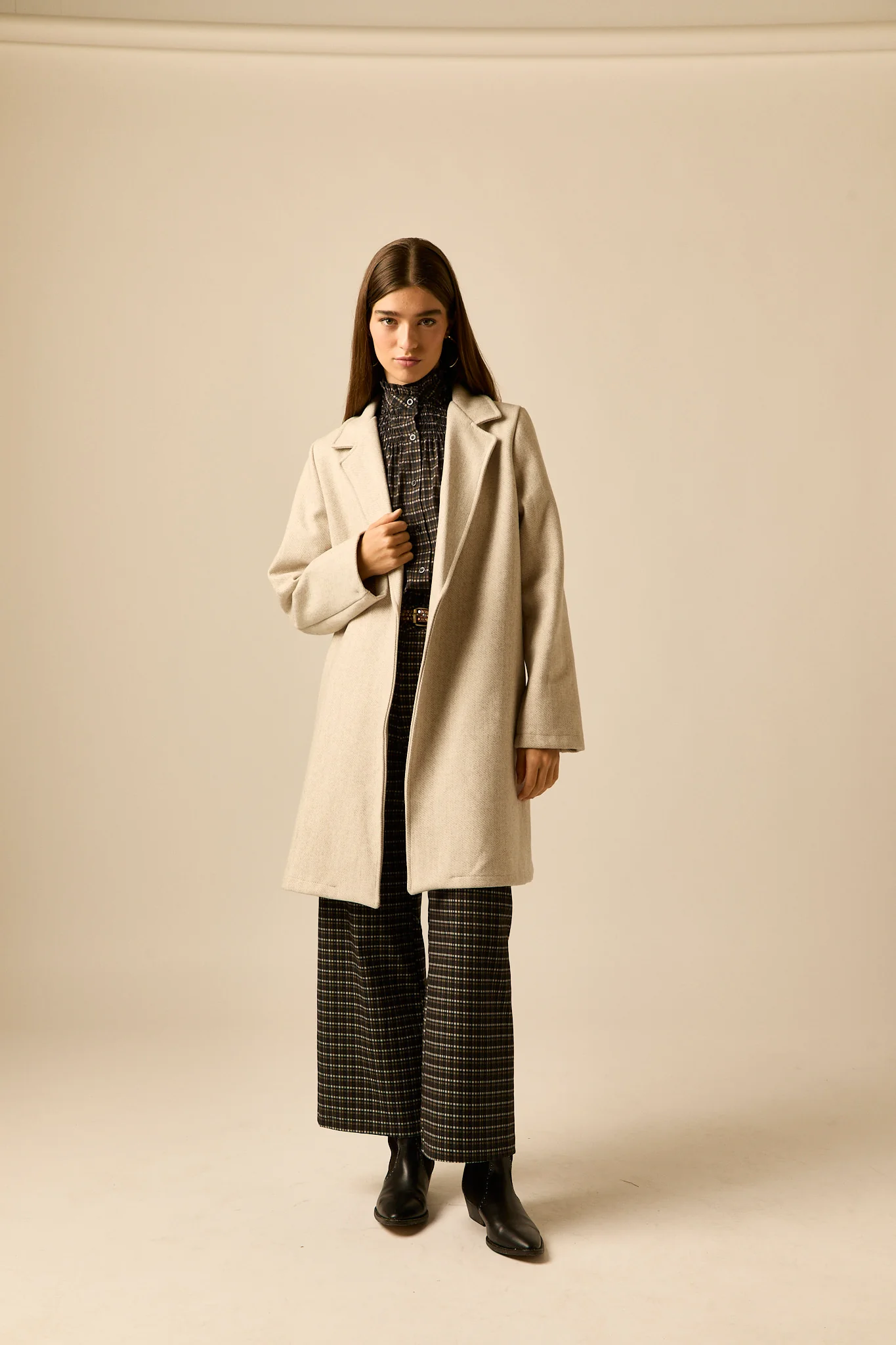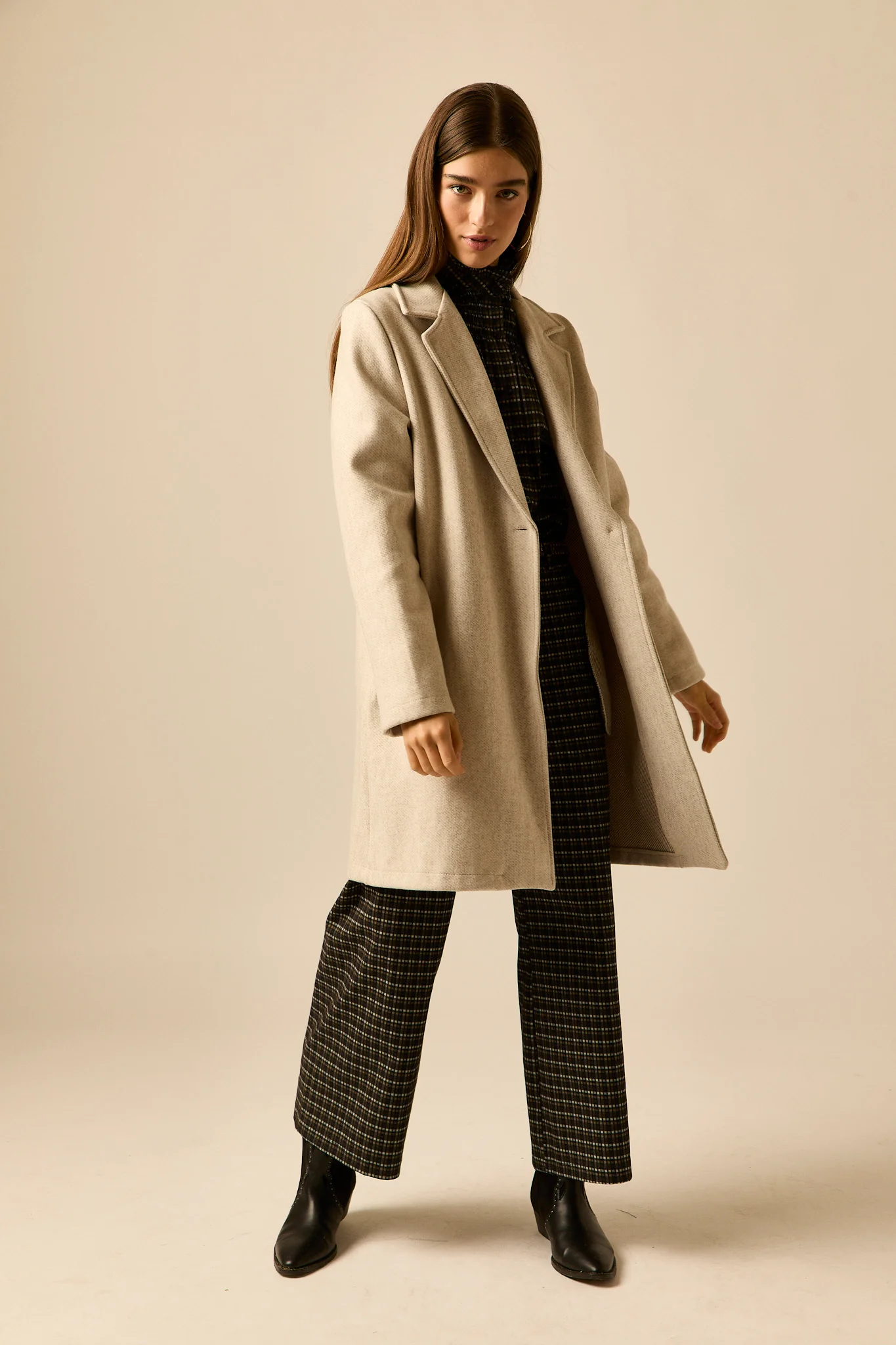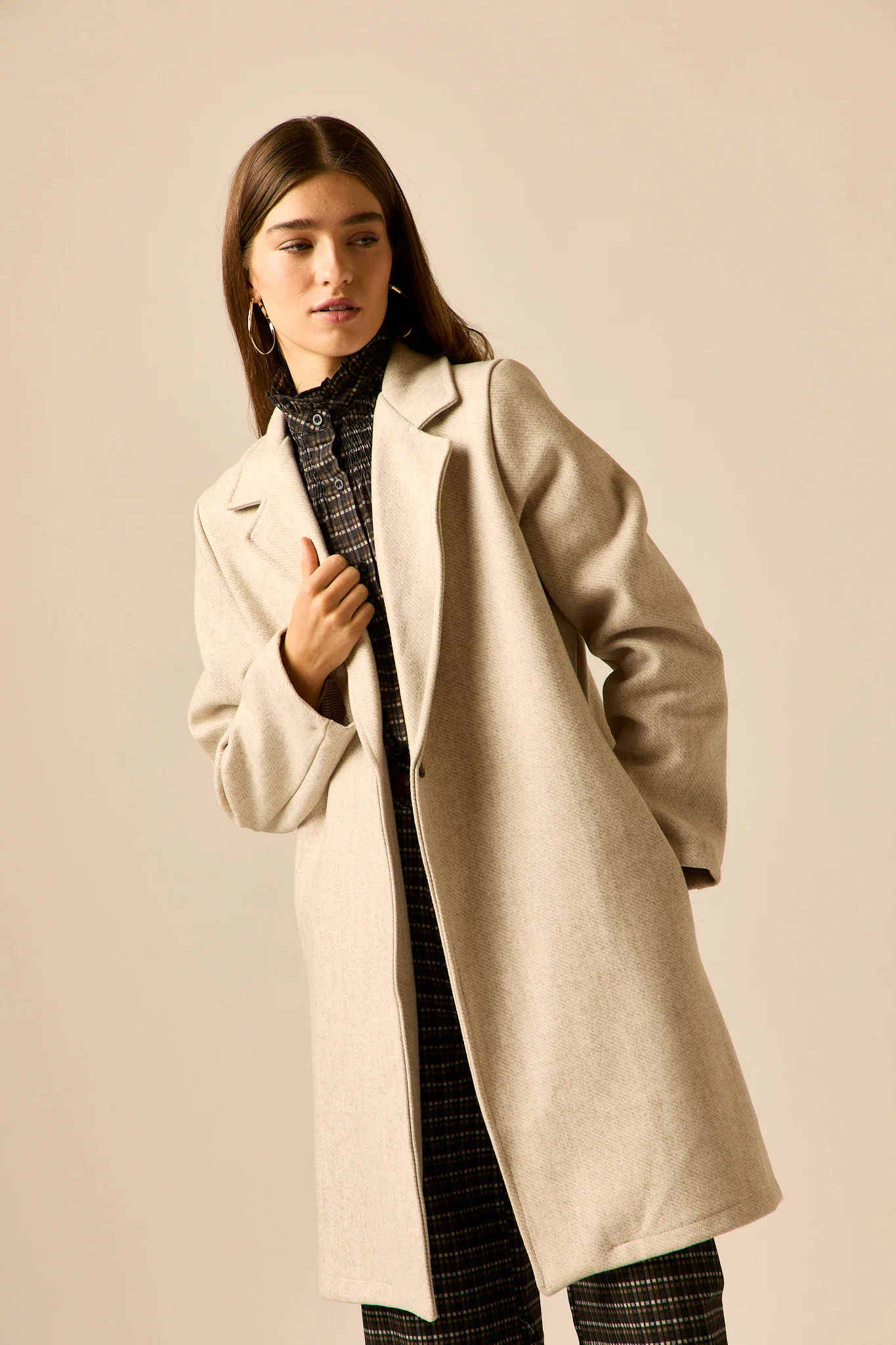 Abrigo clásico de paño liso en color beige. Cuello de solapa, manga larga, forro interior cierre de un botón y dos bolsillos laterales.