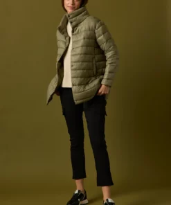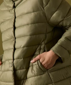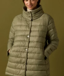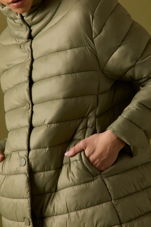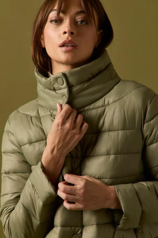 Abrigo de plumas acolchado en color verde. Cuello chimenea, manga larga, dos bolsillos laterales, forro interior y cierre frontal de botones.