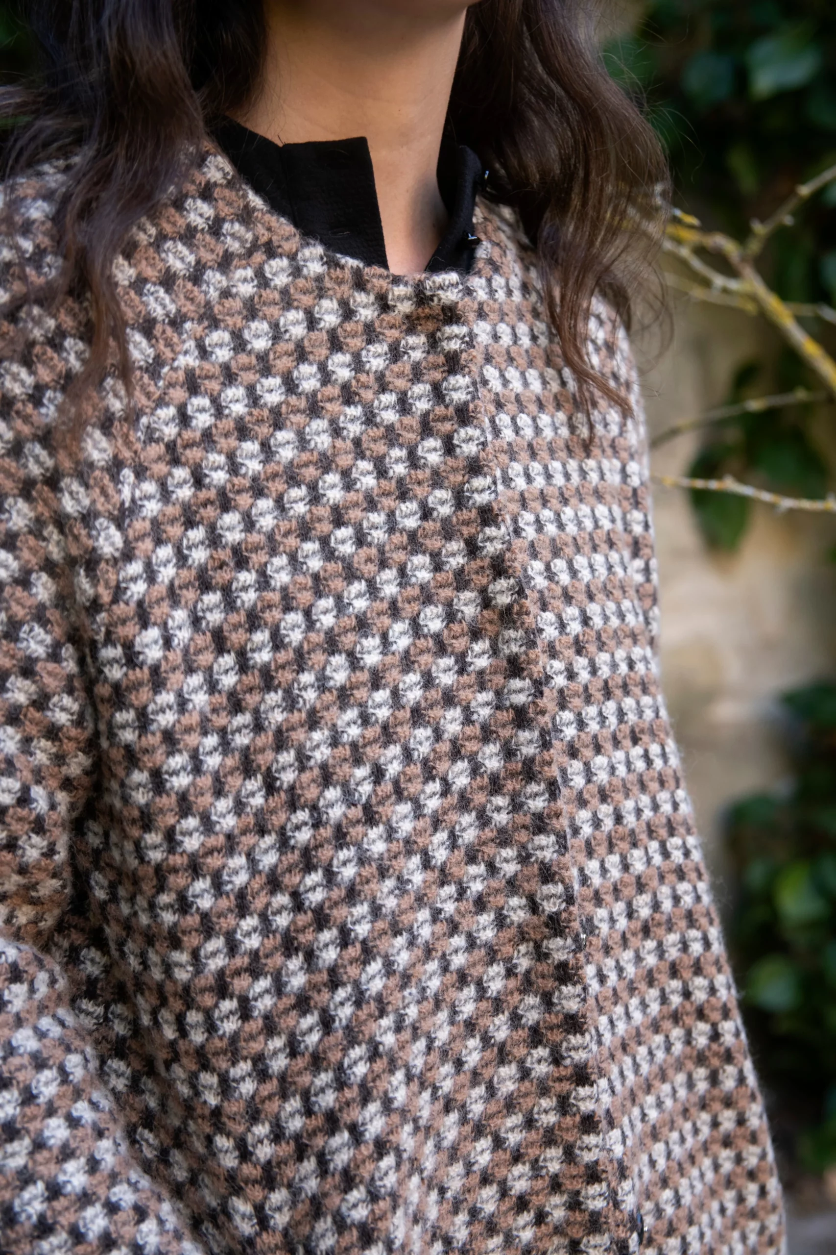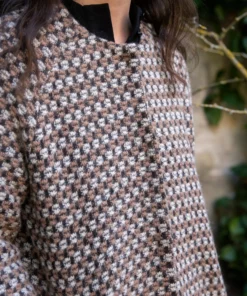 Abrigo realizado en un tejido de mezcla, en tonos beige, crudo y gris, de corte recto.