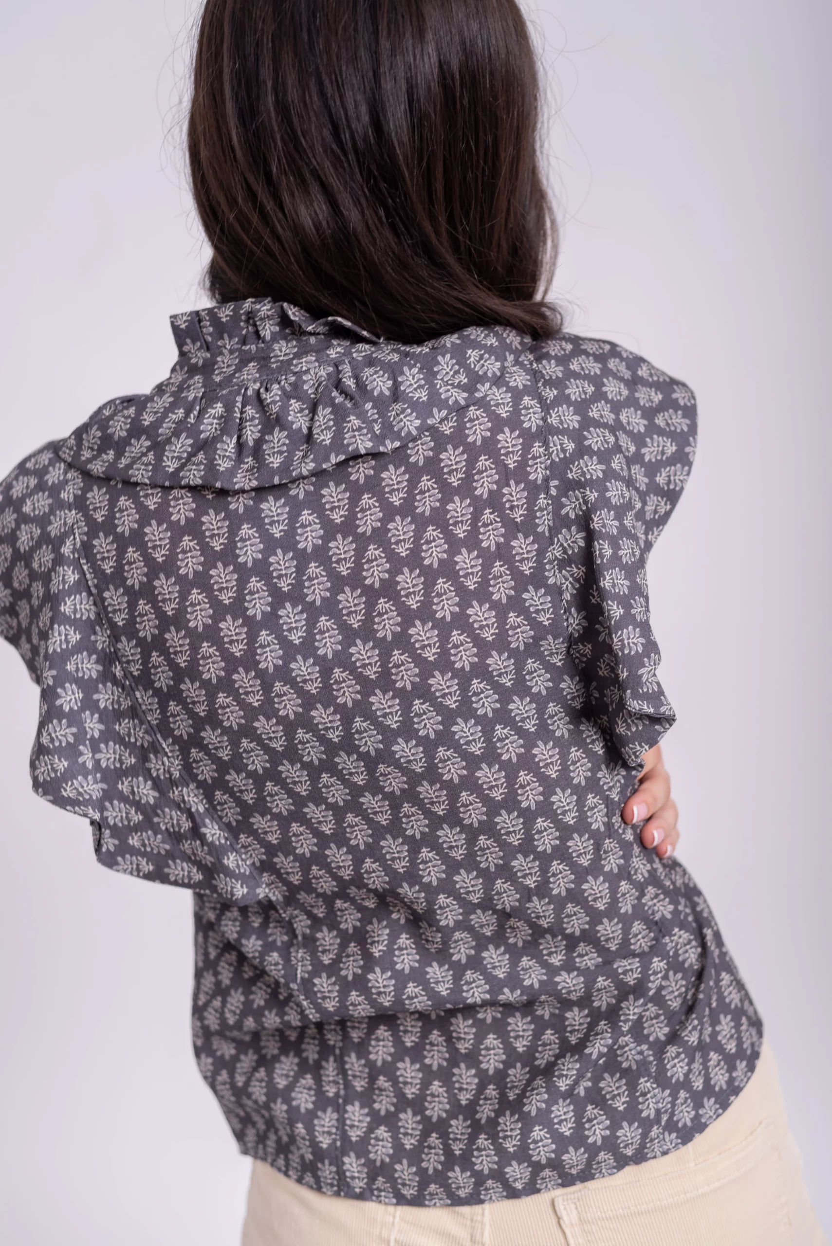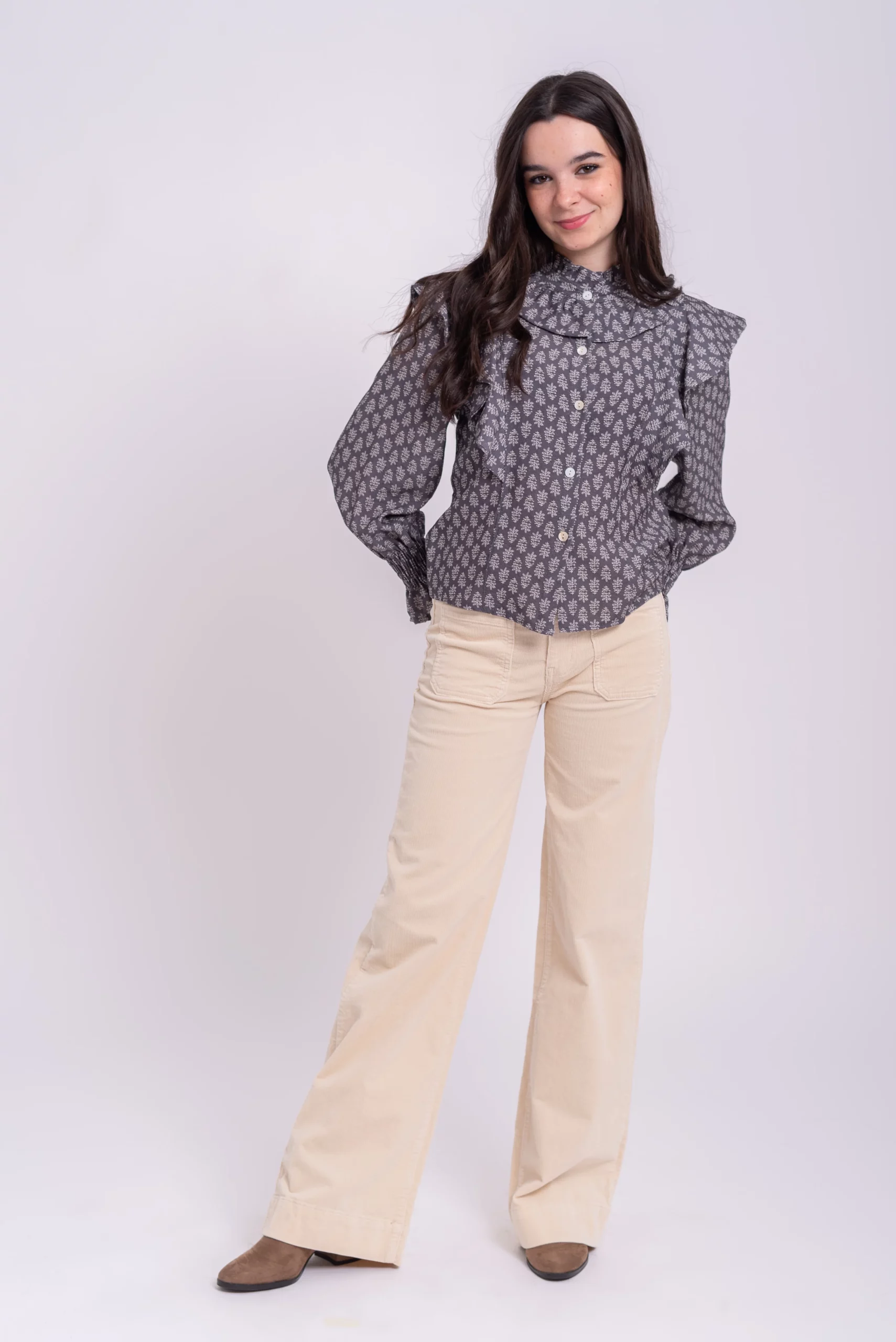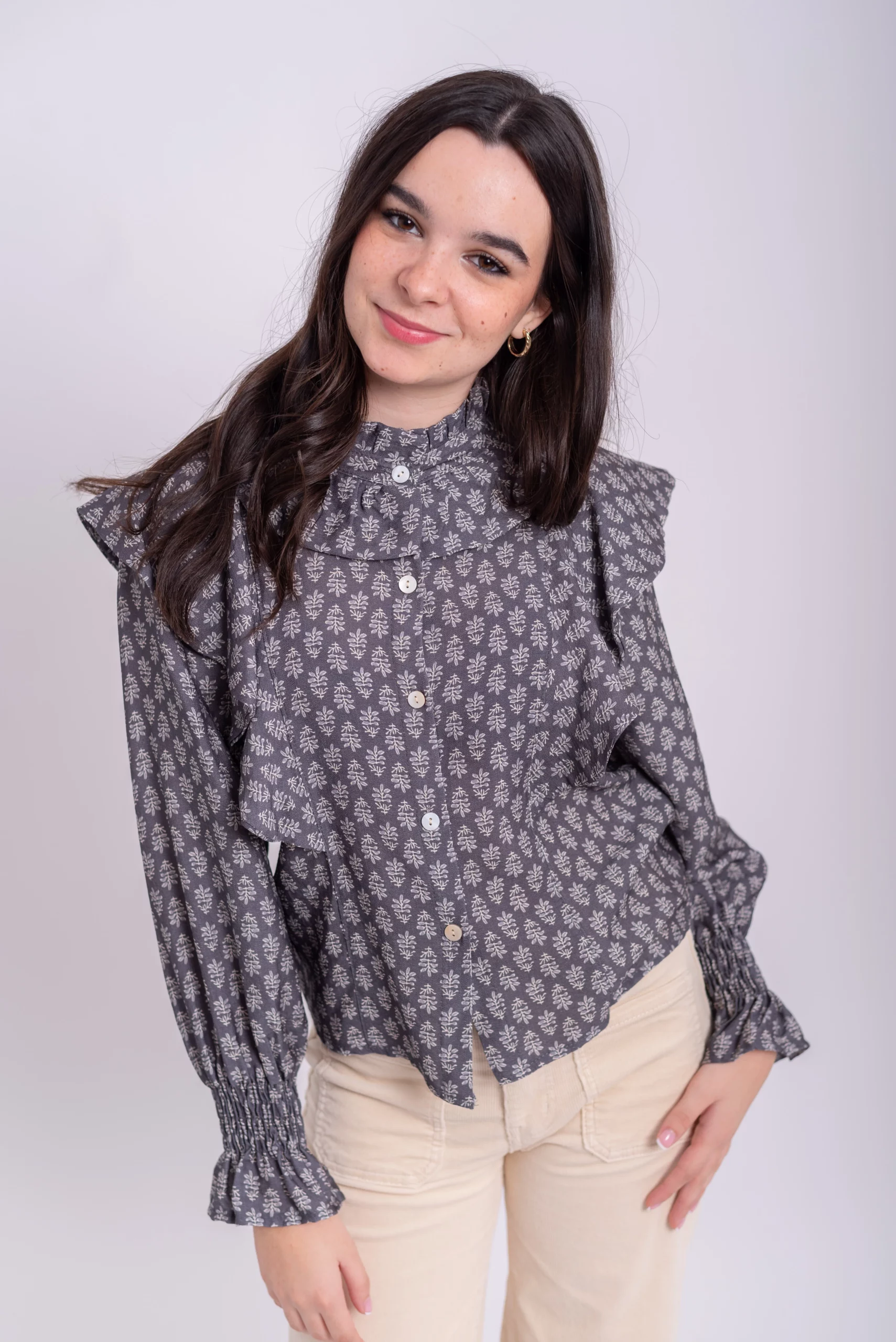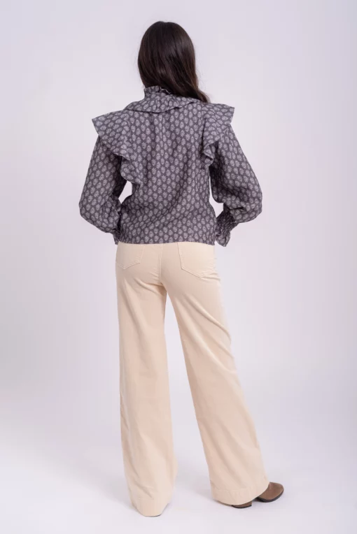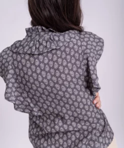 Blusa, cuello redondo. Manga larga. Abotonada sobre el pecho. Detalle de volante alrededor del cuello y sobre los hombros. Estampado floral.