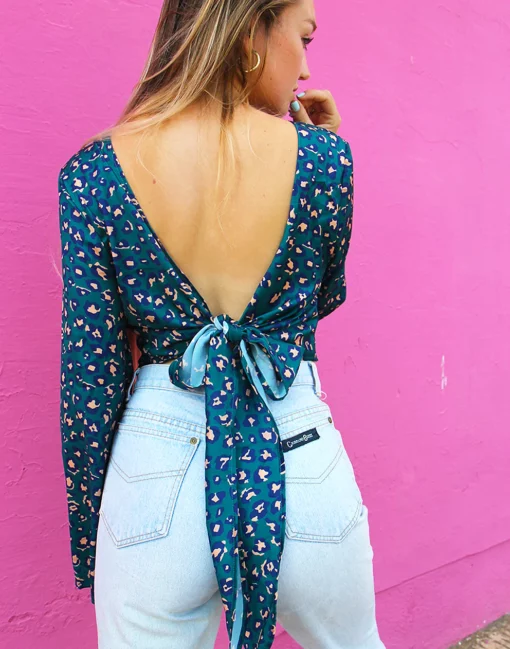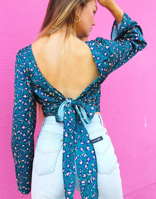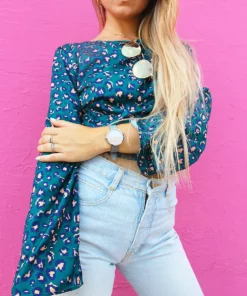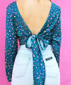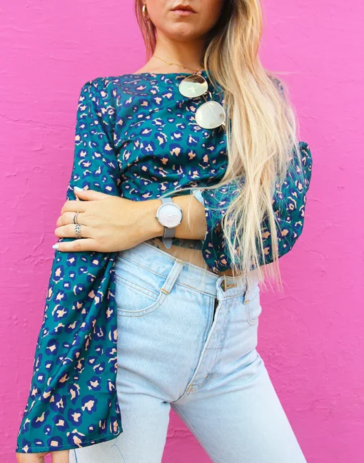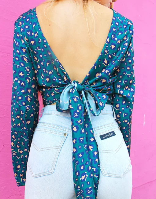 New wrap top in a blue and pink leopard print.