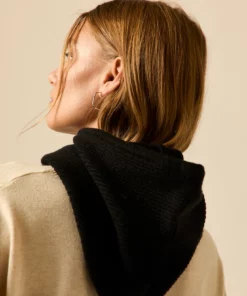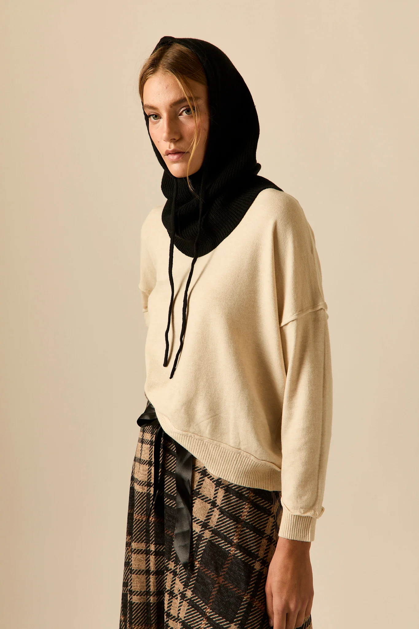 Balaclava de punto en color negro con detalle de cordón y acanalado.