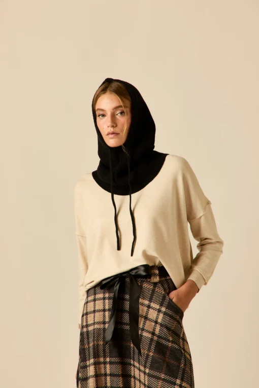 Balaclava de punto en color negro con detalle de cordón y acanalado.