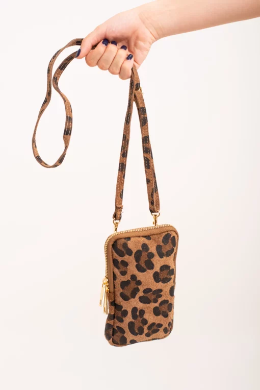 Bandolera de piel, serraje. Estampado en animal print en tono taupe. Cierre cremallera en tono dorado.