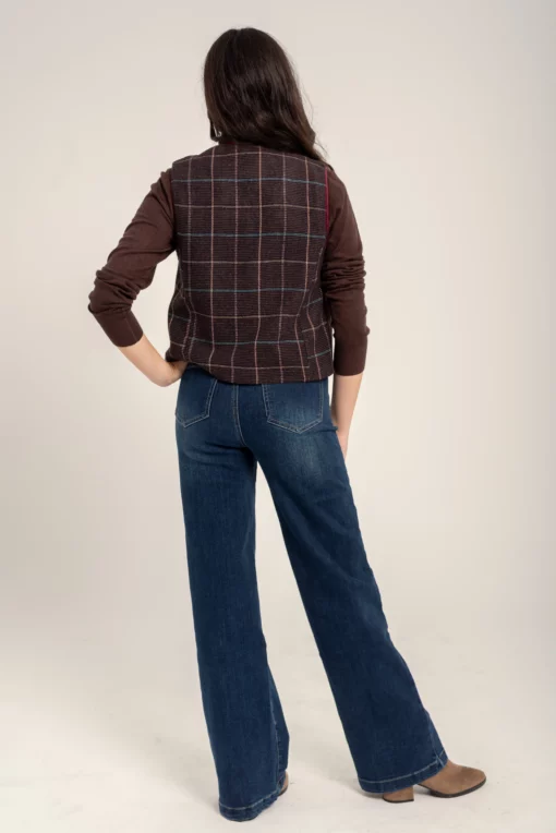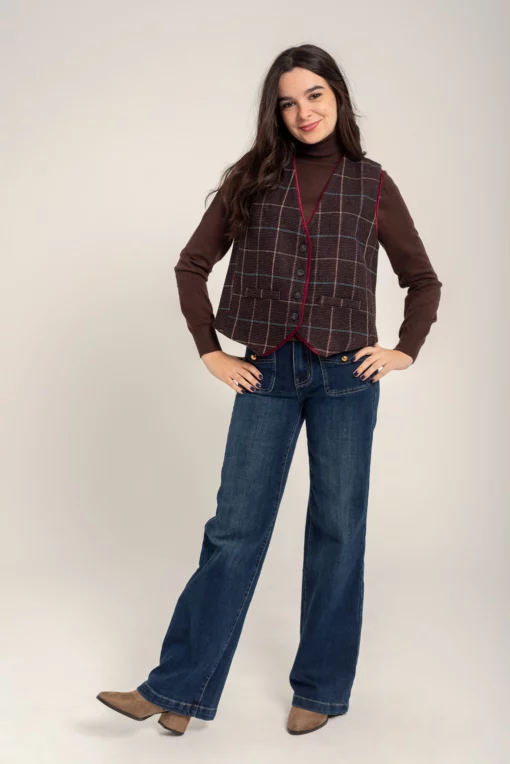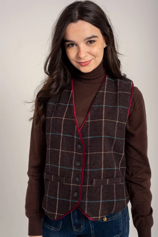 Chaleco sastre. Estampado principe de gales en tono chocolate. Ribete de chaleco en terciopelo borgoña. Abotonado en frontal.
