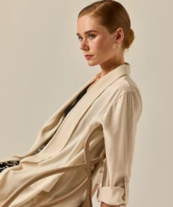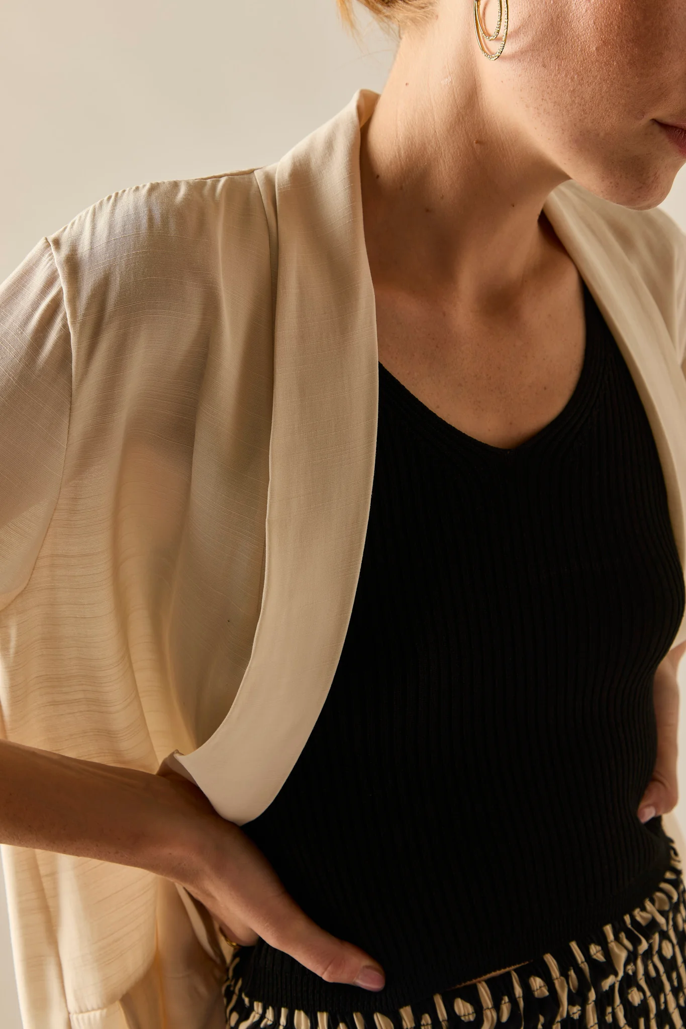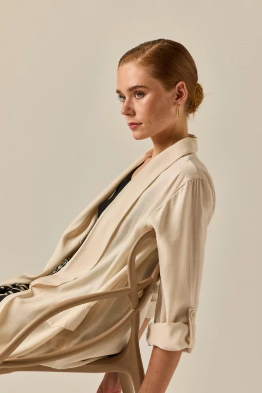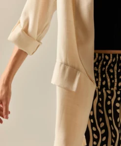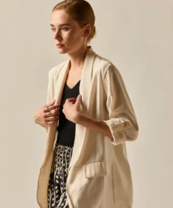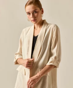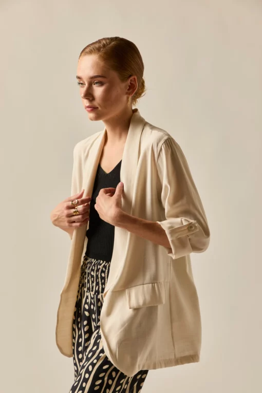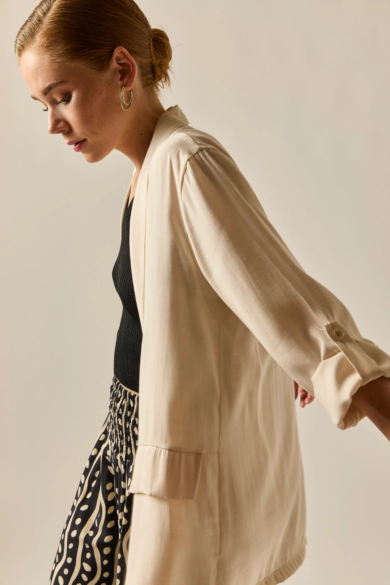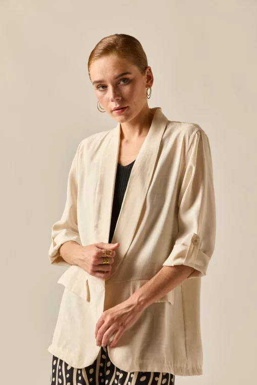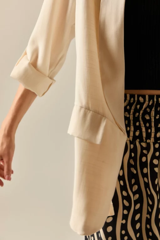Blazer básica en color crema. Diseño clásico, tejido vaporoso, cuello de solapa, manga larga ajustable con botón. Detalle de falsos bolsillos laterales.