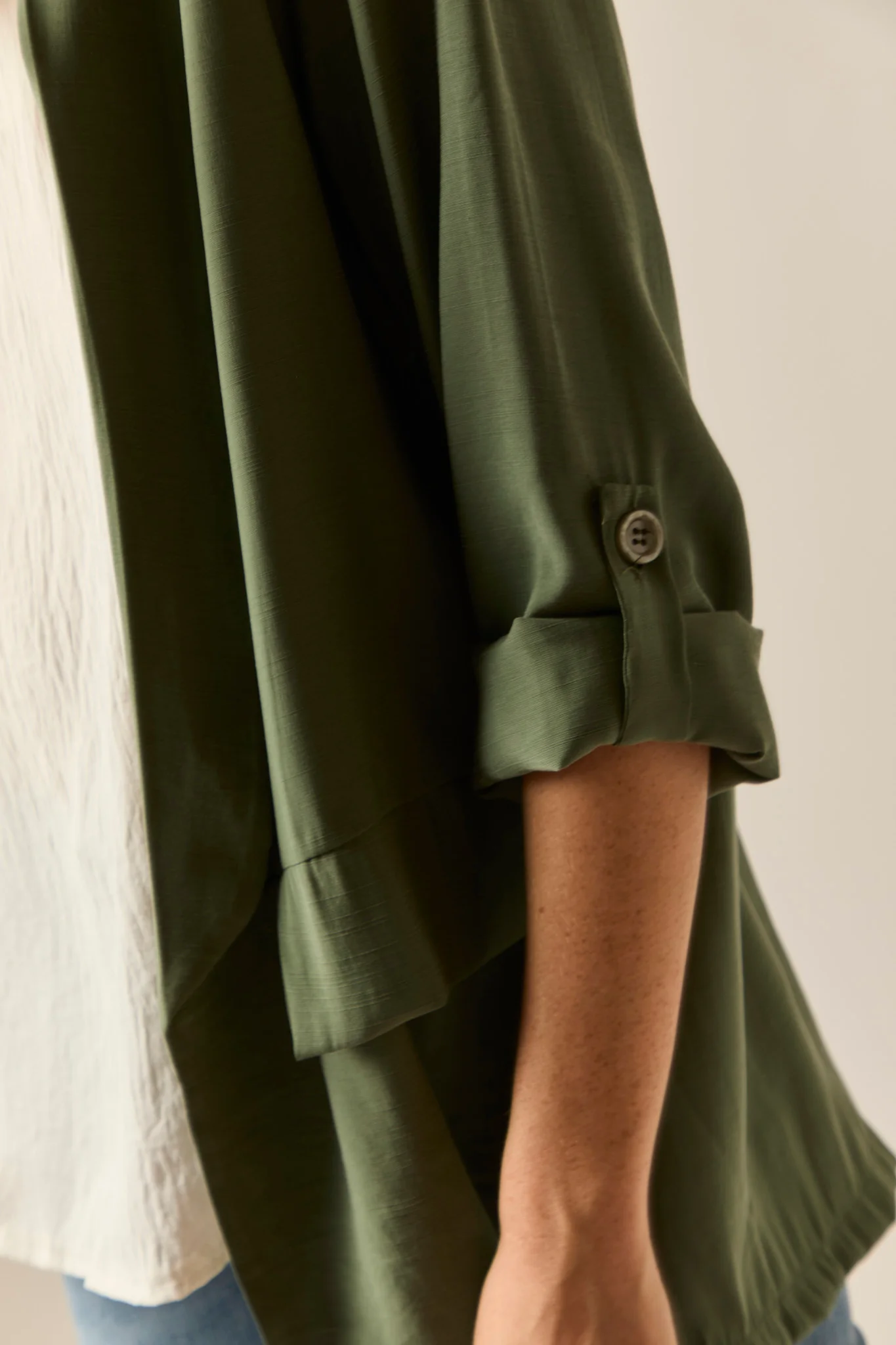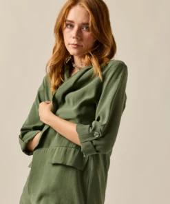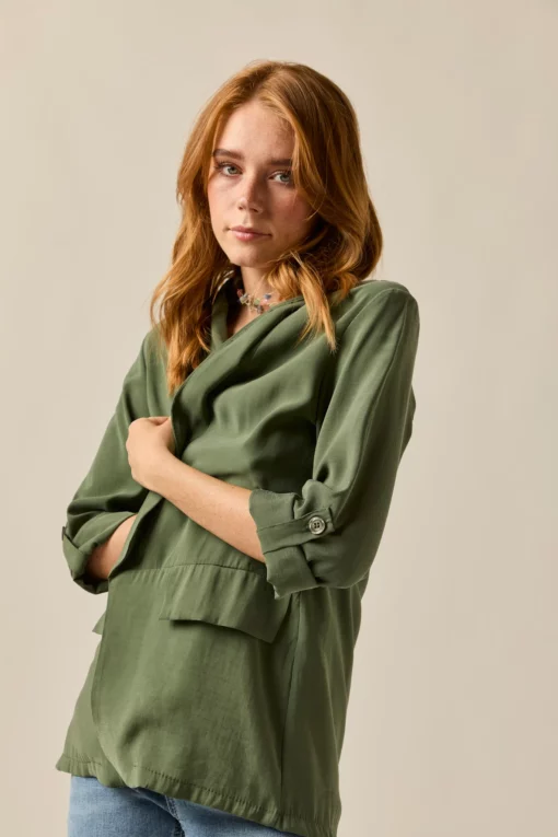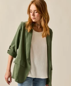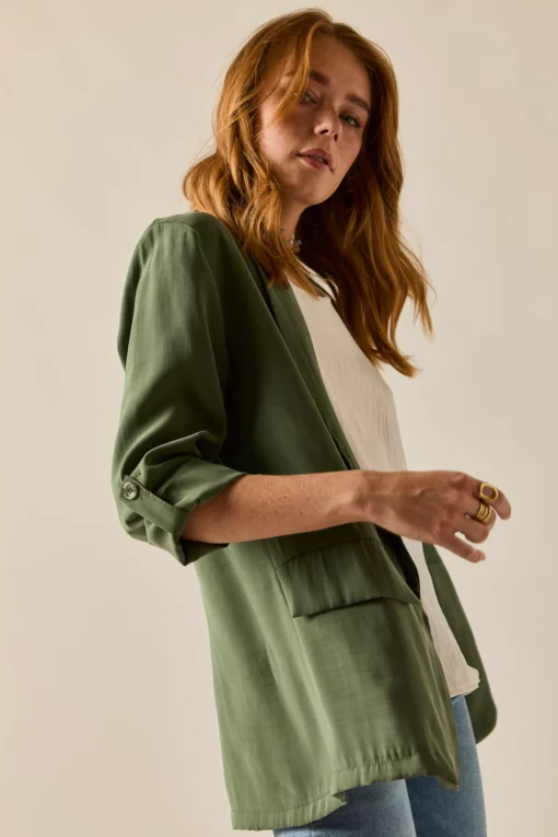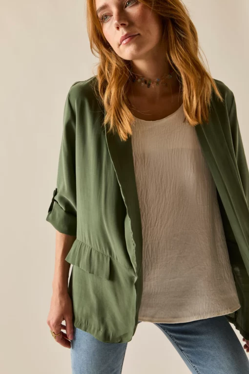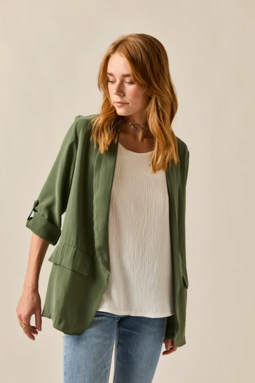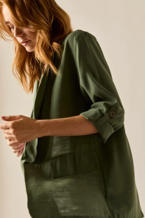 Blazer básica en color verde kaki. Diseño clásico, tejido vaporoso, cuello de solapa, manga larga ajustable con botón. Detalle de falsos bolsillos laterales.