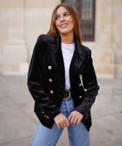 - Blazer entallada de terciopelo con cuello solapa de muesca y manga larga con detalle de botones.