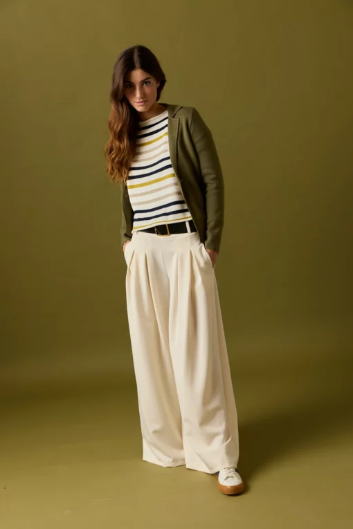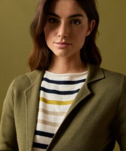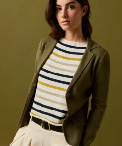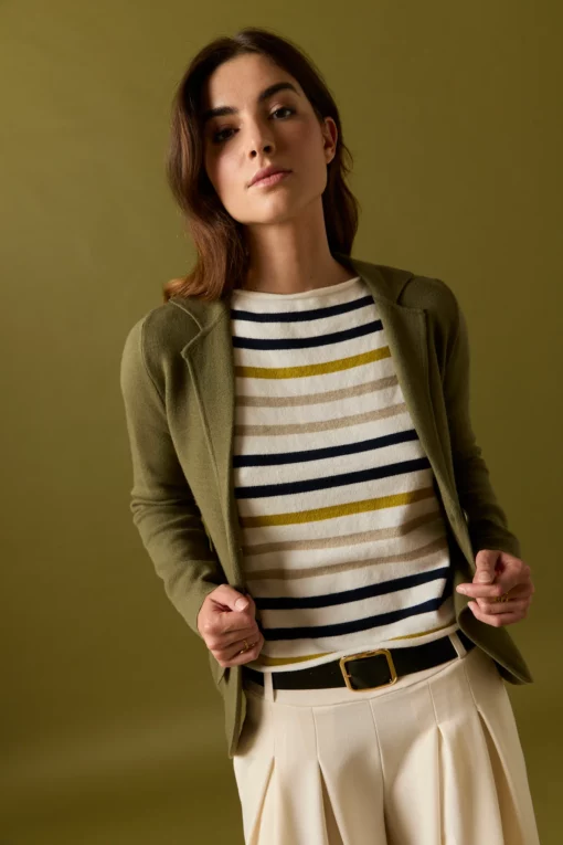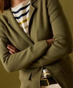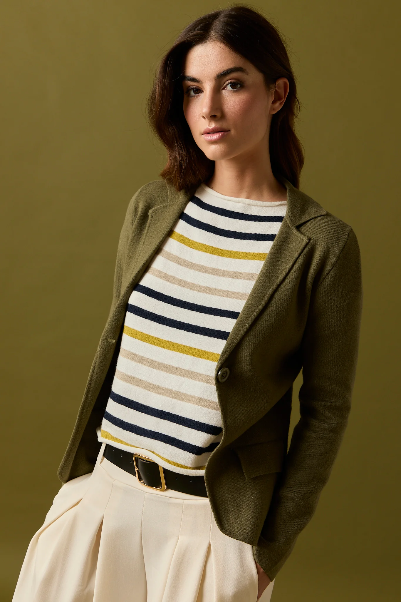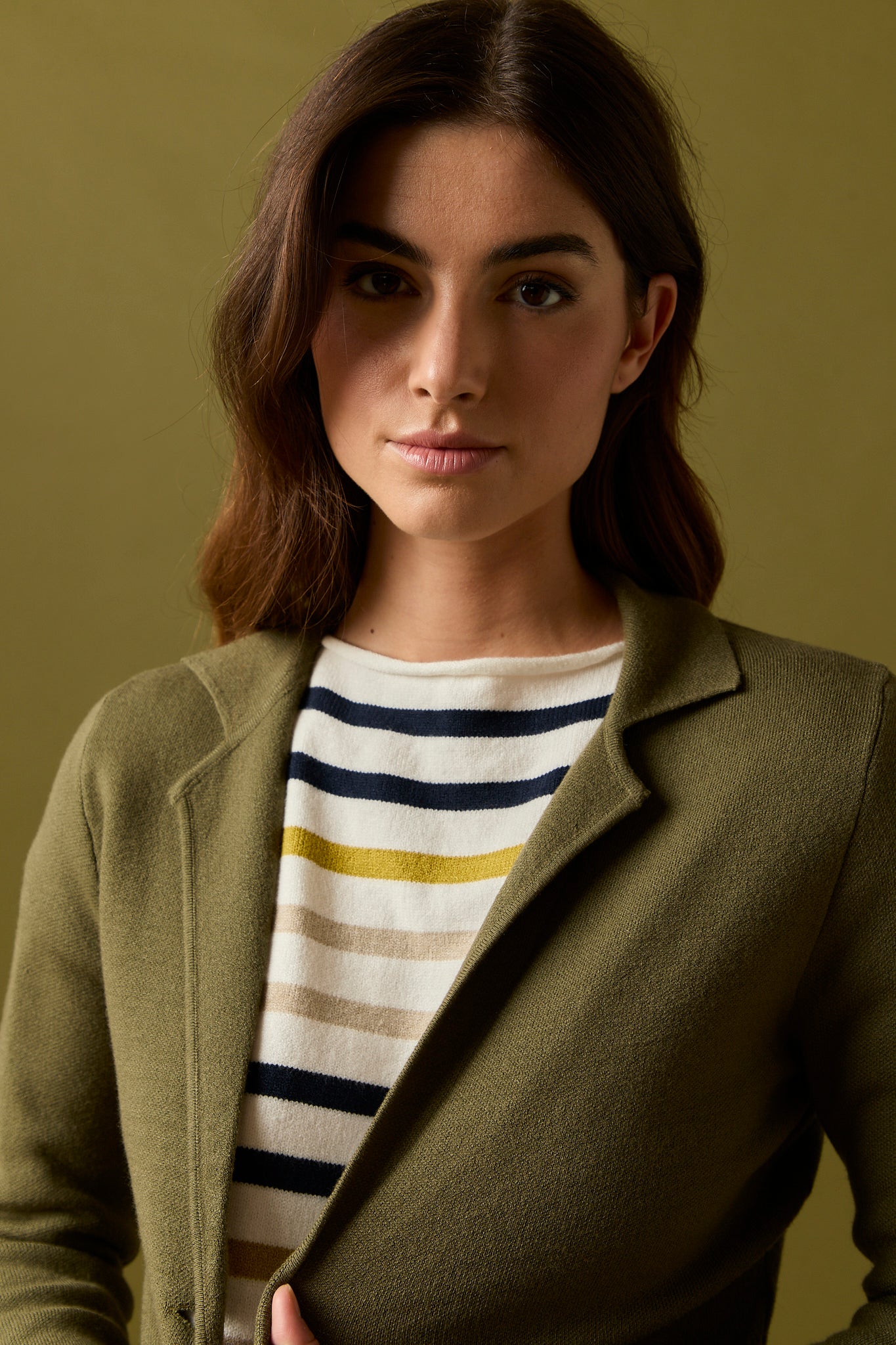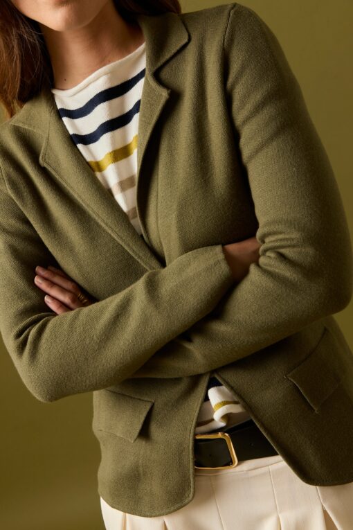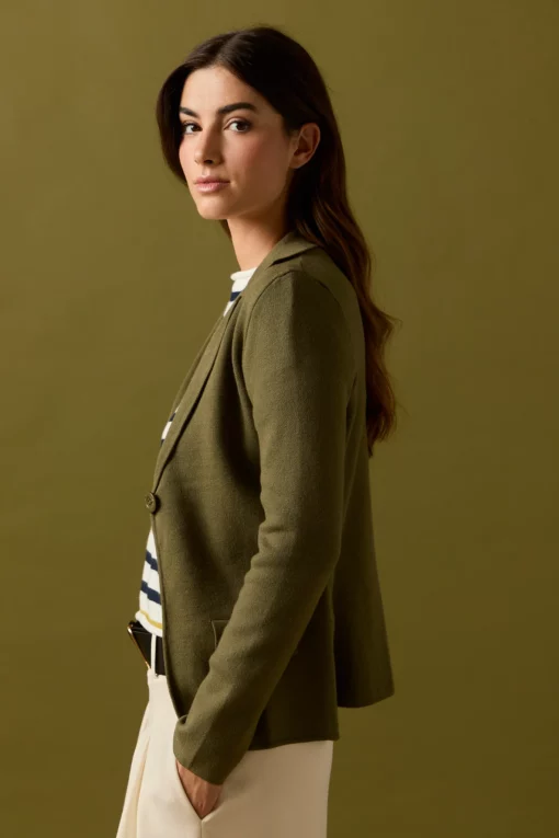 Blazer de punto en color verde kaki. Cuello de solapa, dos bolsillos, manga larga y cierre de botón.