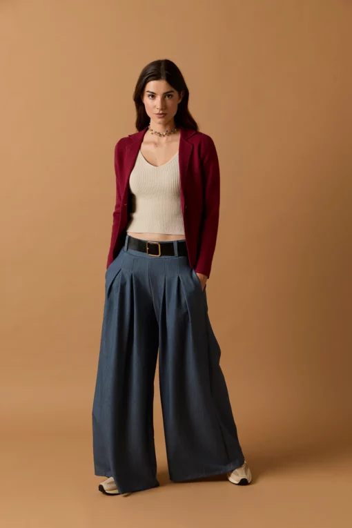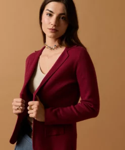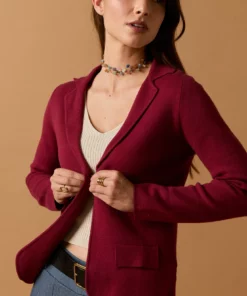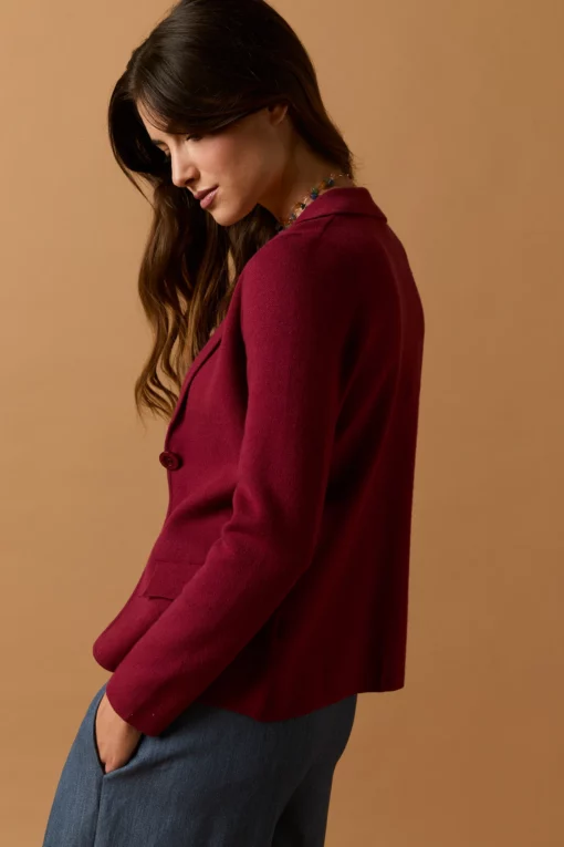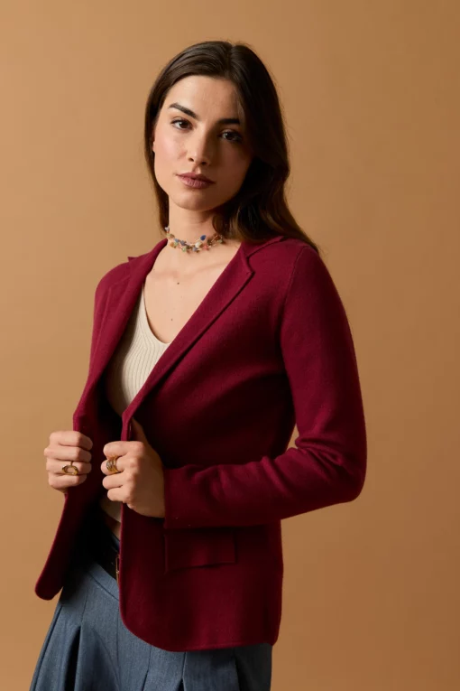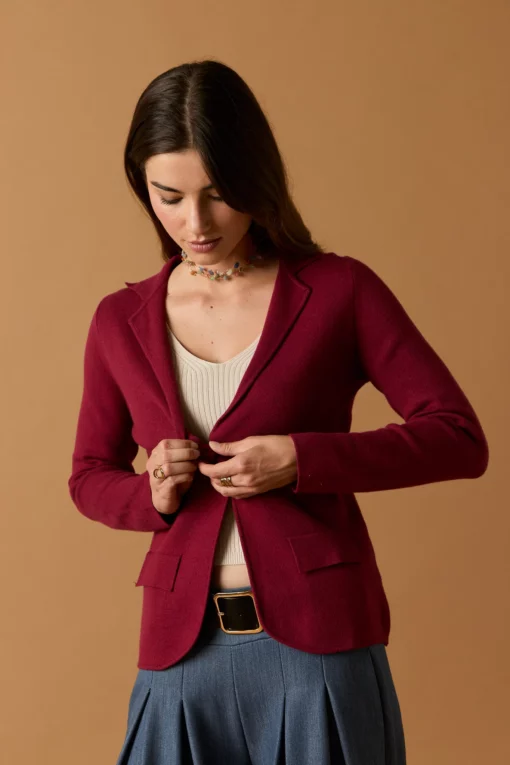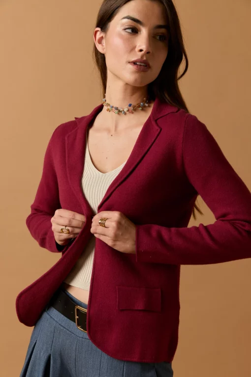 Blazer de punto en color vino. Cuello de solapa, dos bolsillos, manga larga y cierre de botón.
