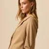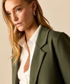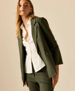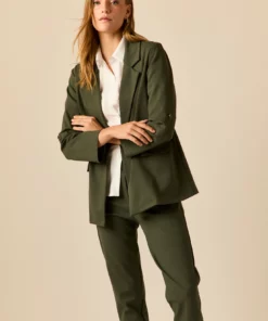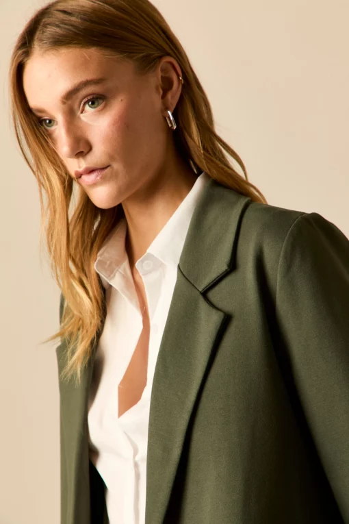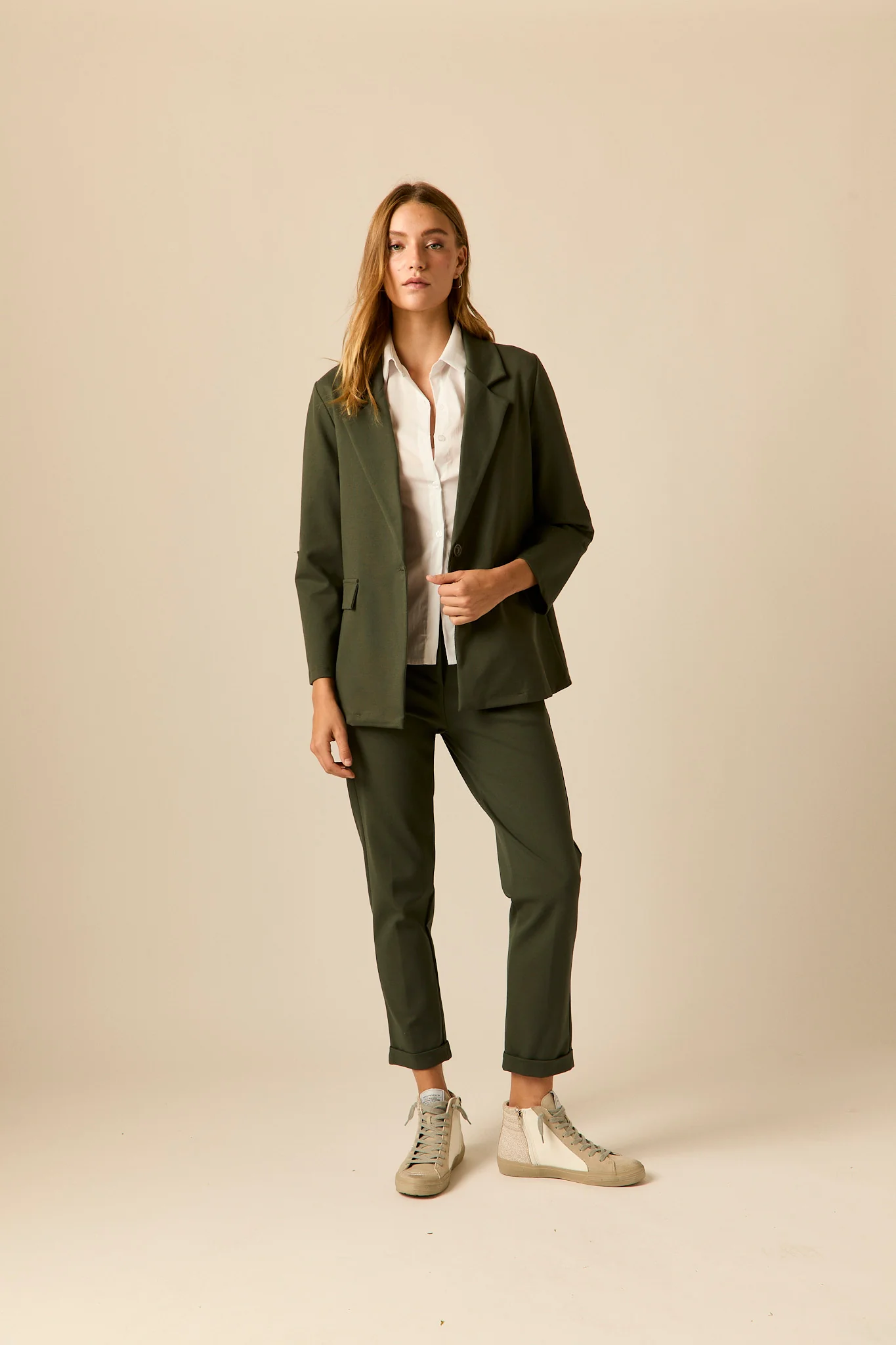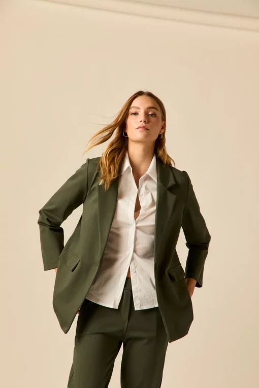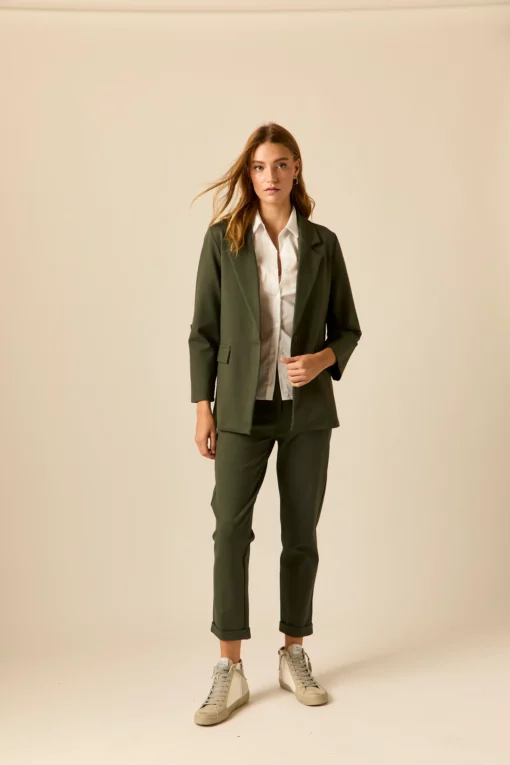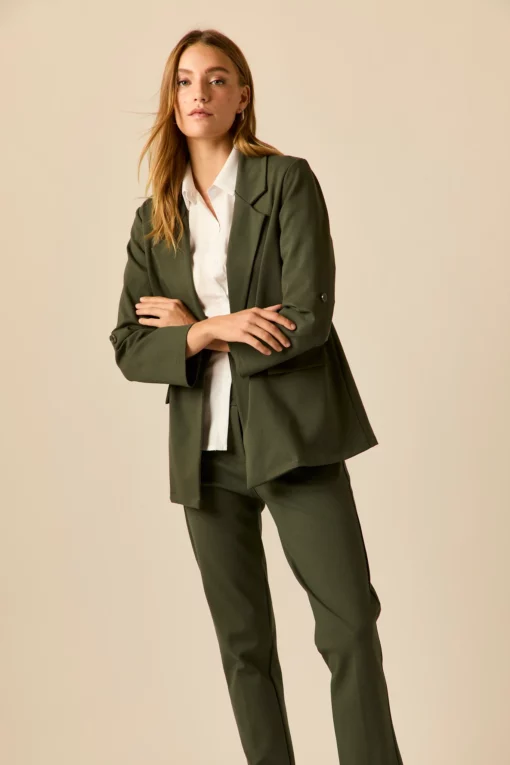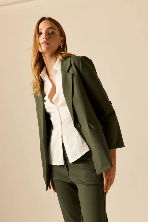 Blazer básica en color verde kaki. Cuello de solapa, falsos bolsillos laterales, manga larga ajustable con botón y cierre de un botón.