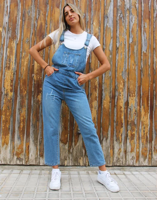 Measurements – 8.5″(22cm) top of bib – 11″(28cm) bottom of bib – 30″(82cm) waist – 38″(97cm) hips – 29″(74cm) inner leg – 11″(28cm) rise.