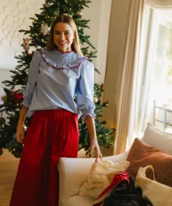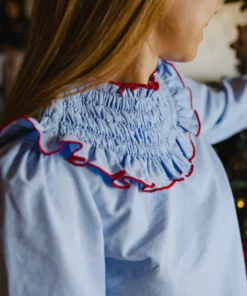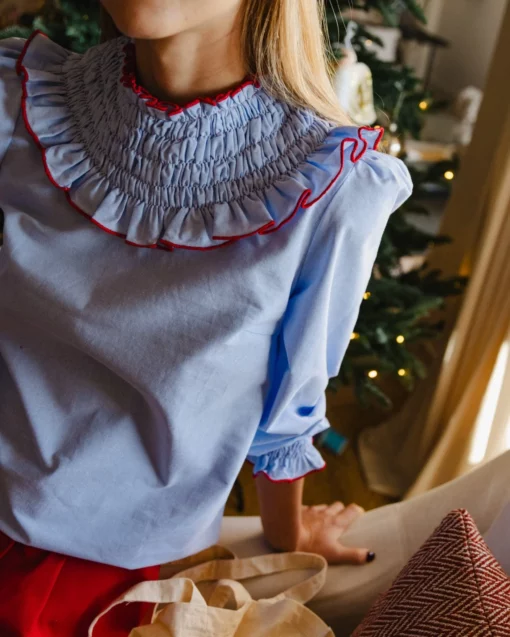 Algodón azul oxford y un favorecedor repulgo rojo que hace súper navideño.