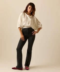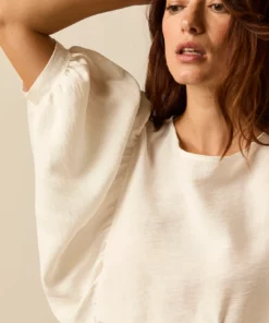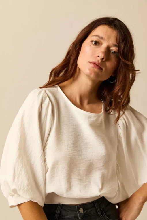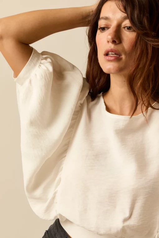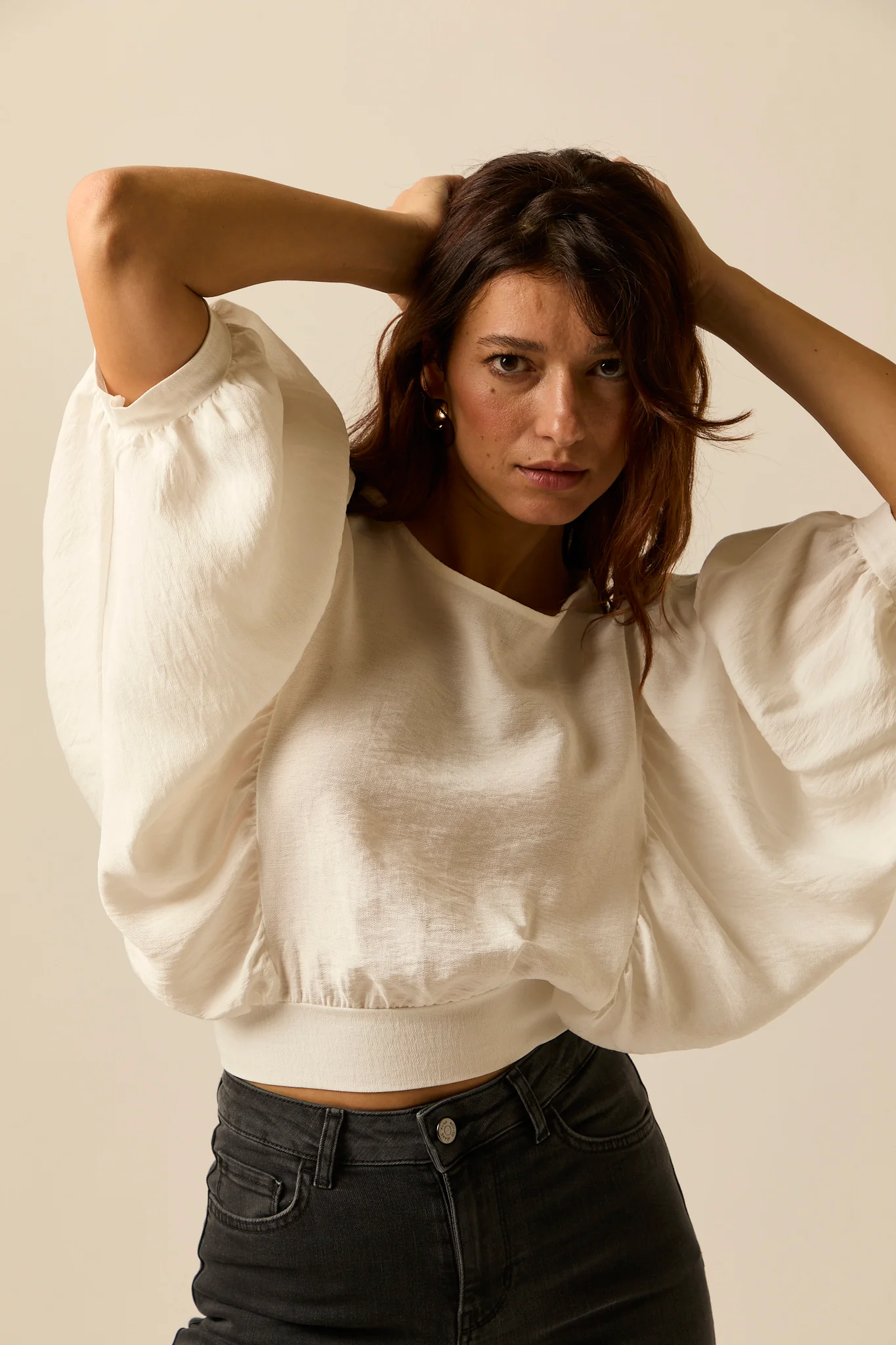 Blusa cropped en color blanco. Cuello caja, manga 3/4 abullonada, escote en la espalda y cierre de lazo.