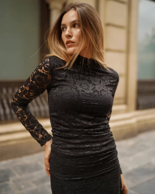 - Blusa entallada de encaje, manga larga y cuello alto.