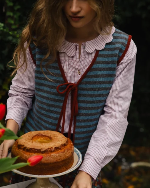 Blusita súper femenina con cuello de ondas en cuadro fino color burdeos.
