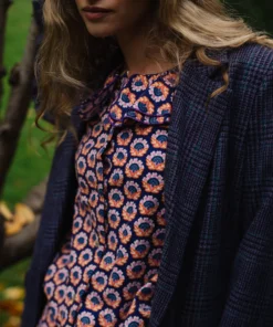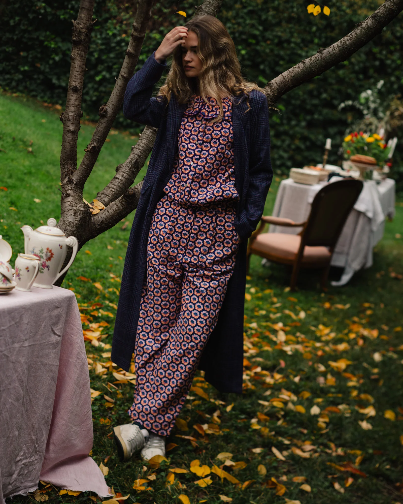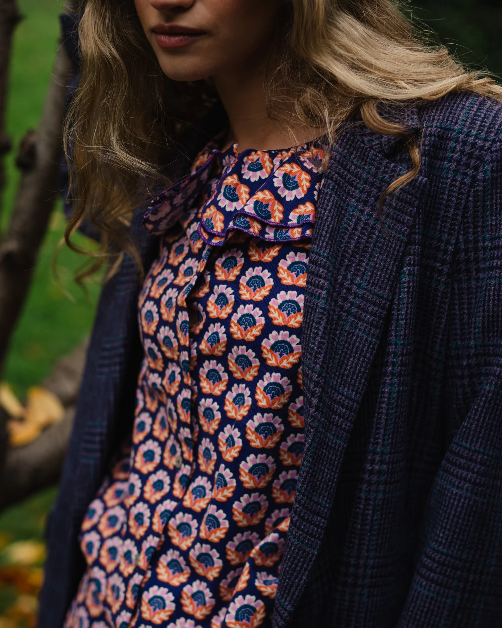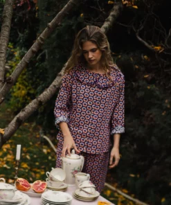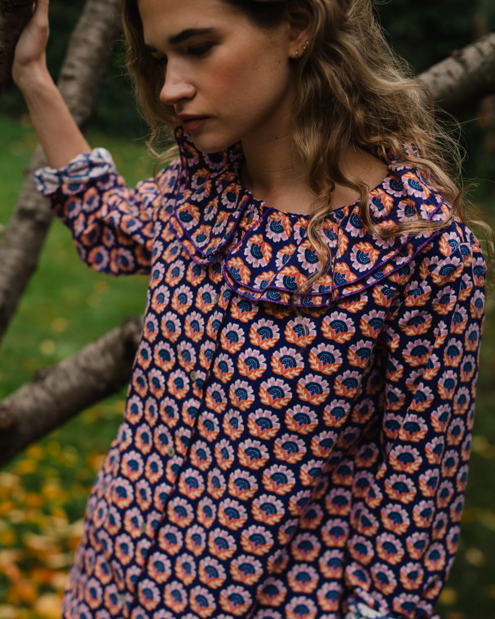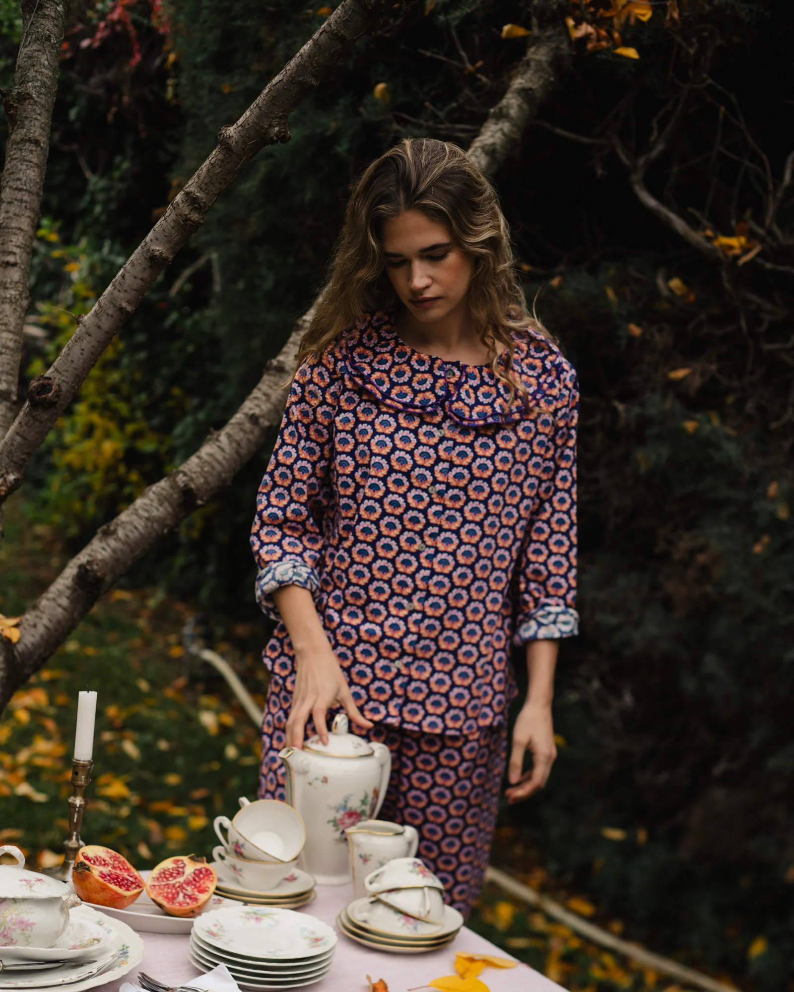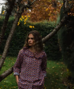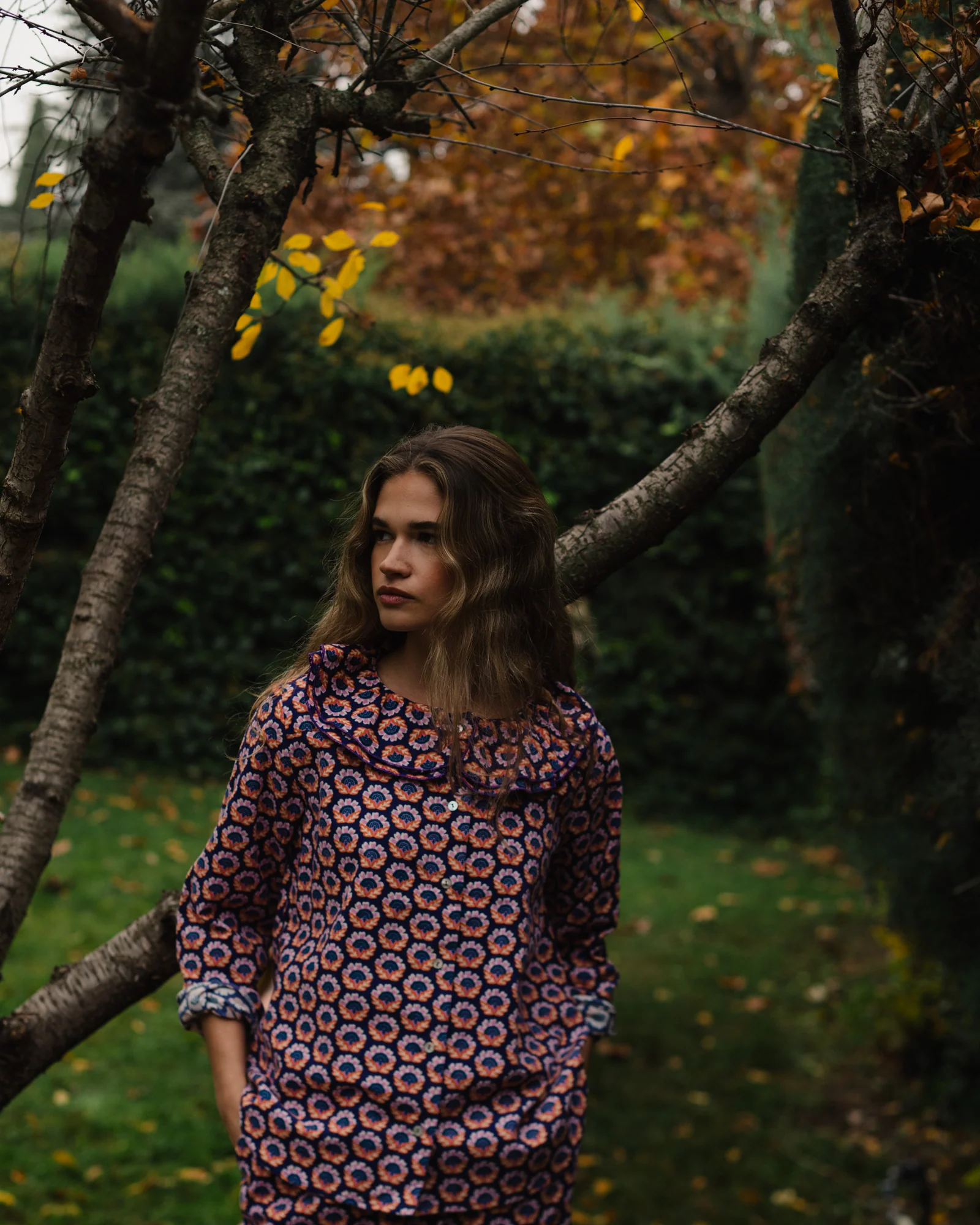 Blusita recta de doble cuello y manga larga en micro pana estampada.