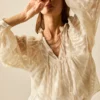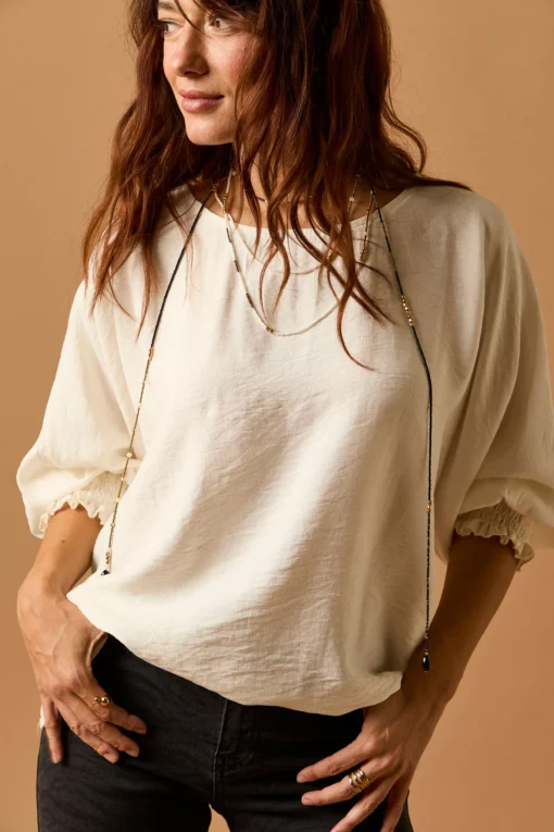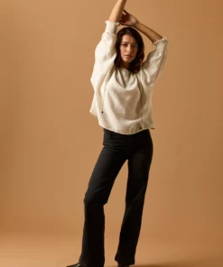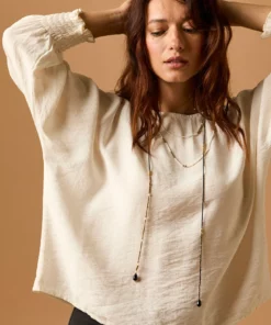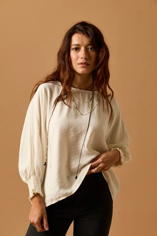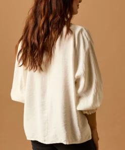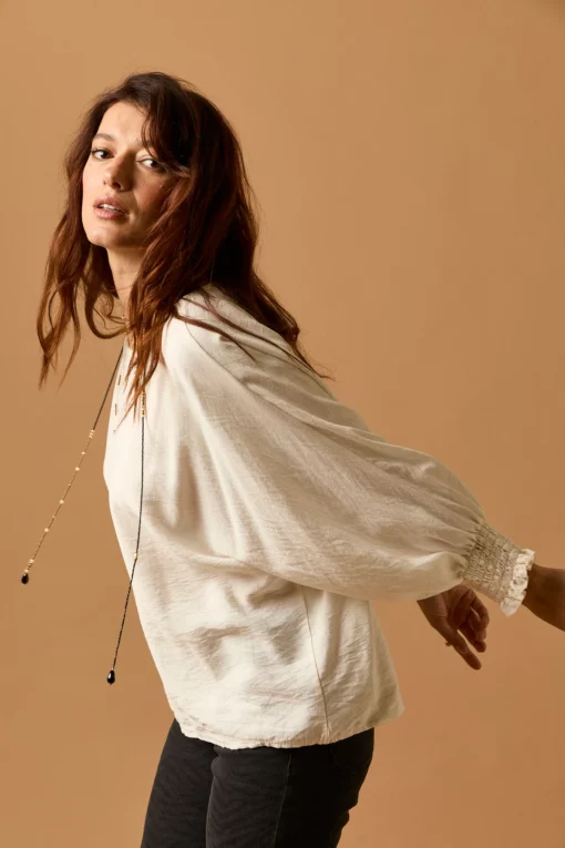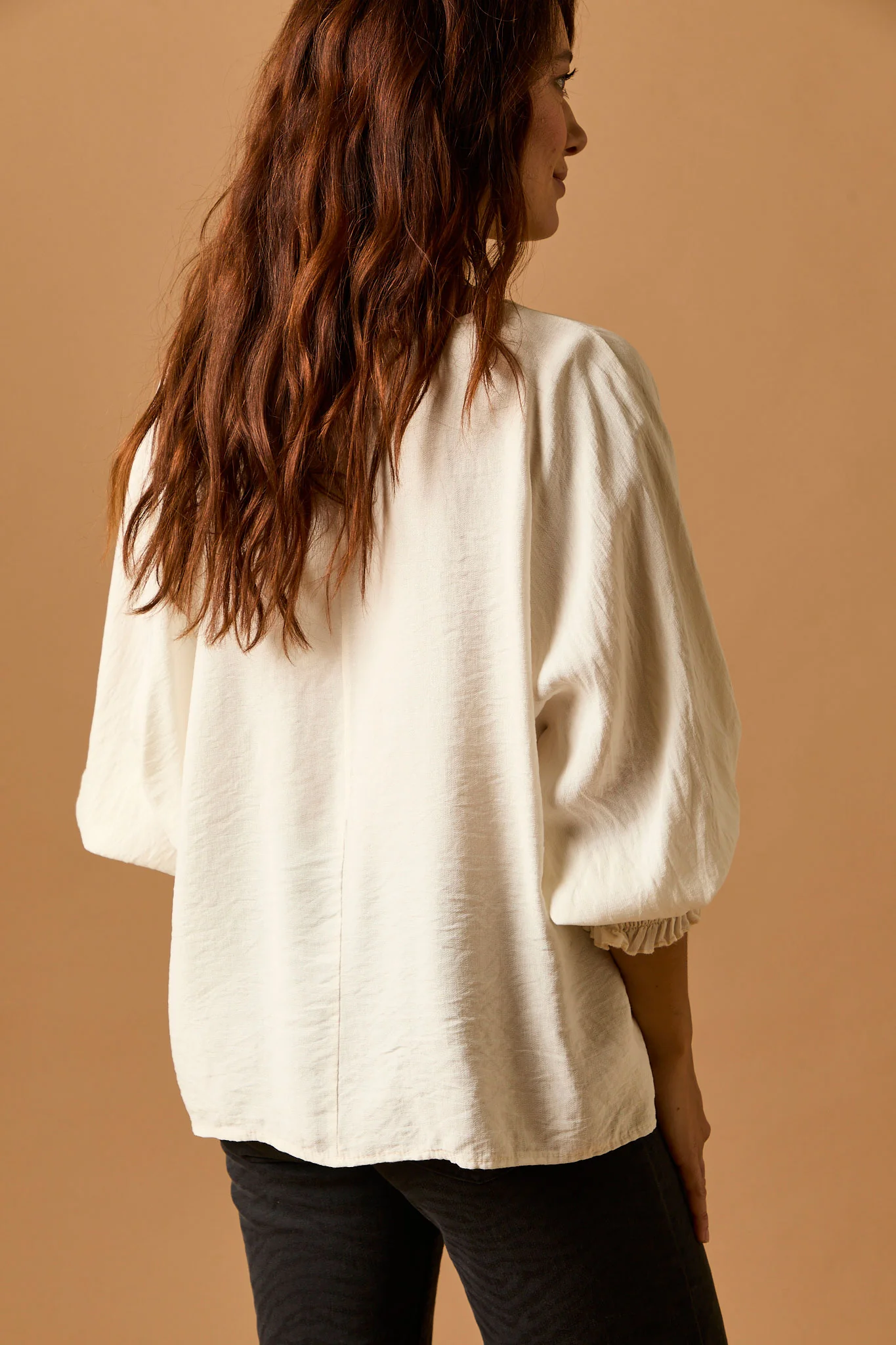 Blusa con diseño oversice en color blanco. Cuello caja, manga larga abullonada y detalle de gomas en los puños.