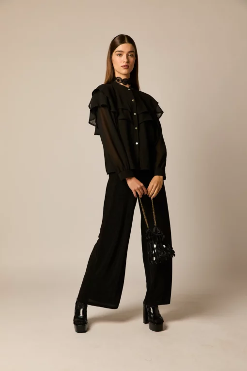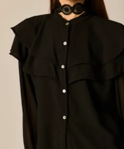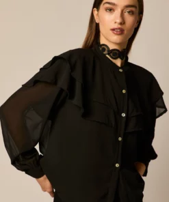 Blusa fluida lisa en color negro. Cuello mao, manga larga abullonada semi transparente, detalle de volantes en el pecho y cierre frontal de botones.
