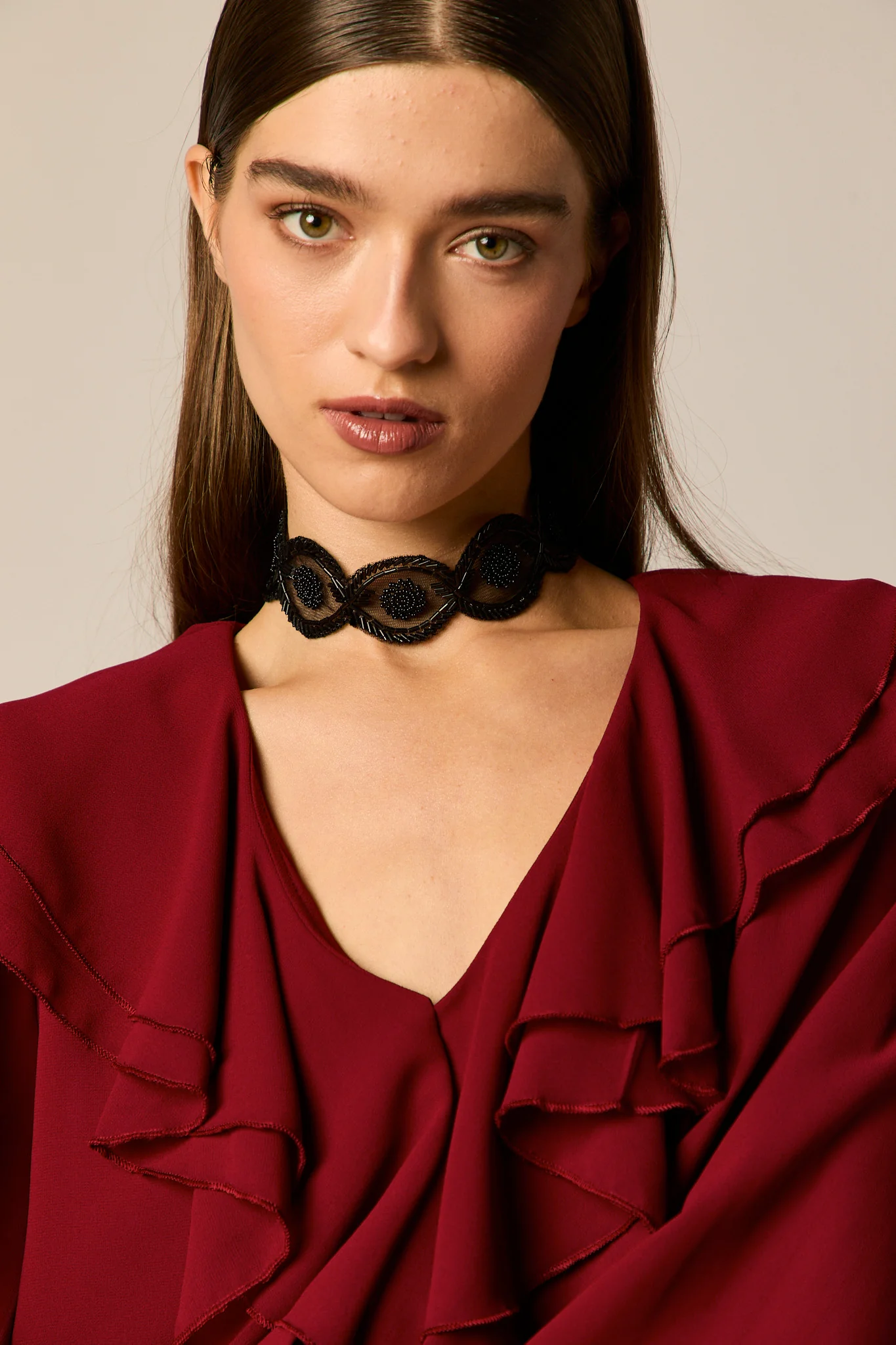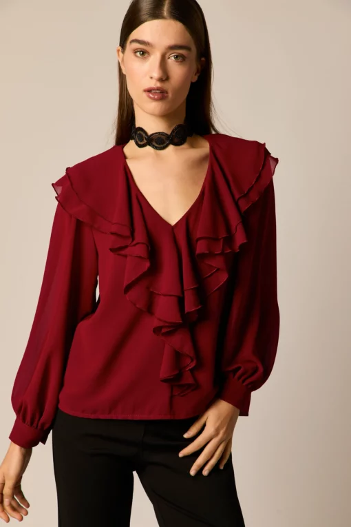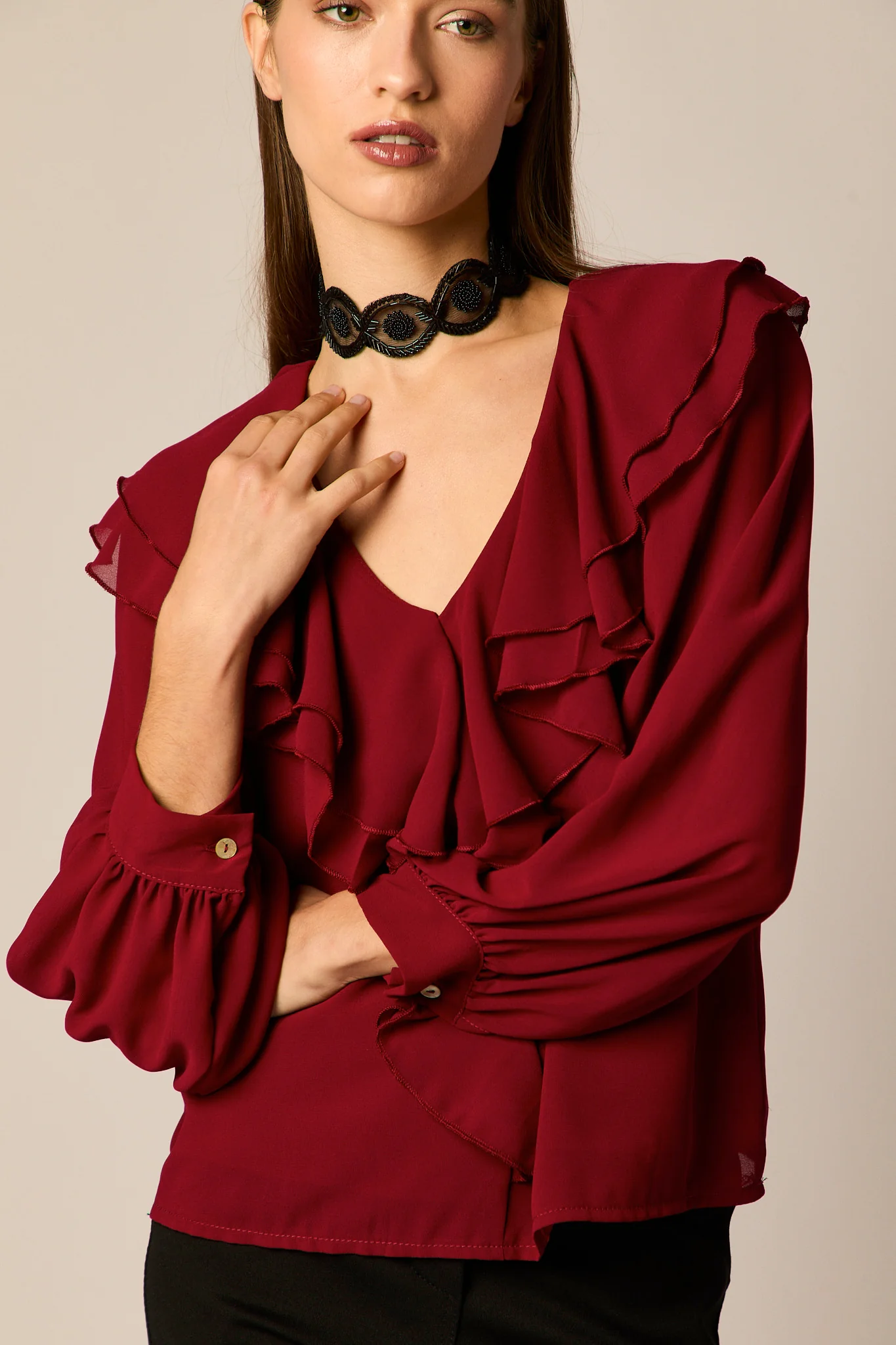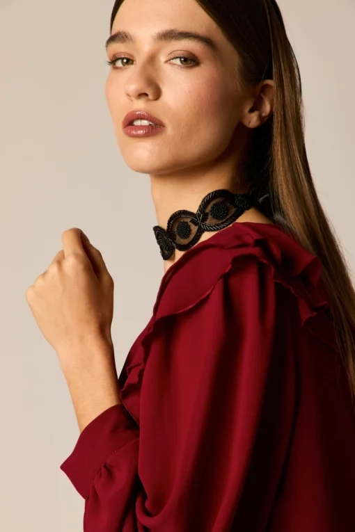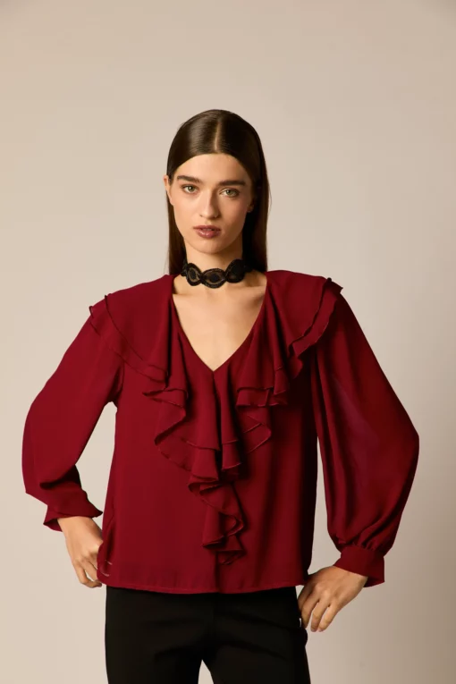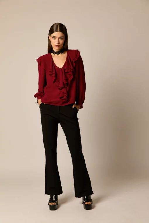 Blusa fluida lisa en color granate. Cuello pico, manga larga abullonada semi transparente, y detalle de volantes en el pecho.