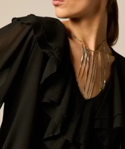 Blusa fluida lisa en color negro. Cuello pico, manga larga abullonada semi transparente, y detalle de volantes en el pecho.