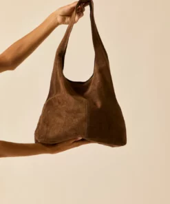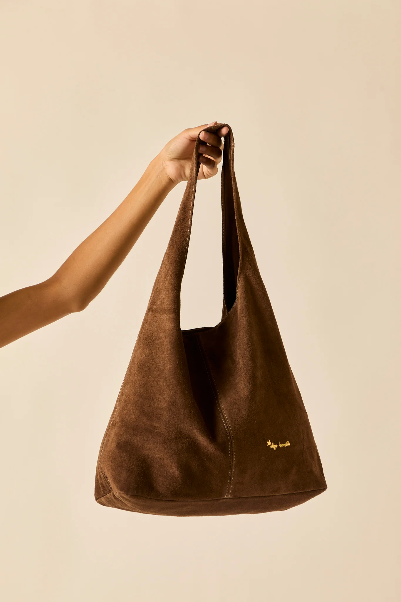 Bolsa de ante grande en color topo. Diseño ancho, bolsillo interior y cierre de cremallera. Medidas: 43 cm de ancho x 32 cm de alto.