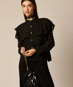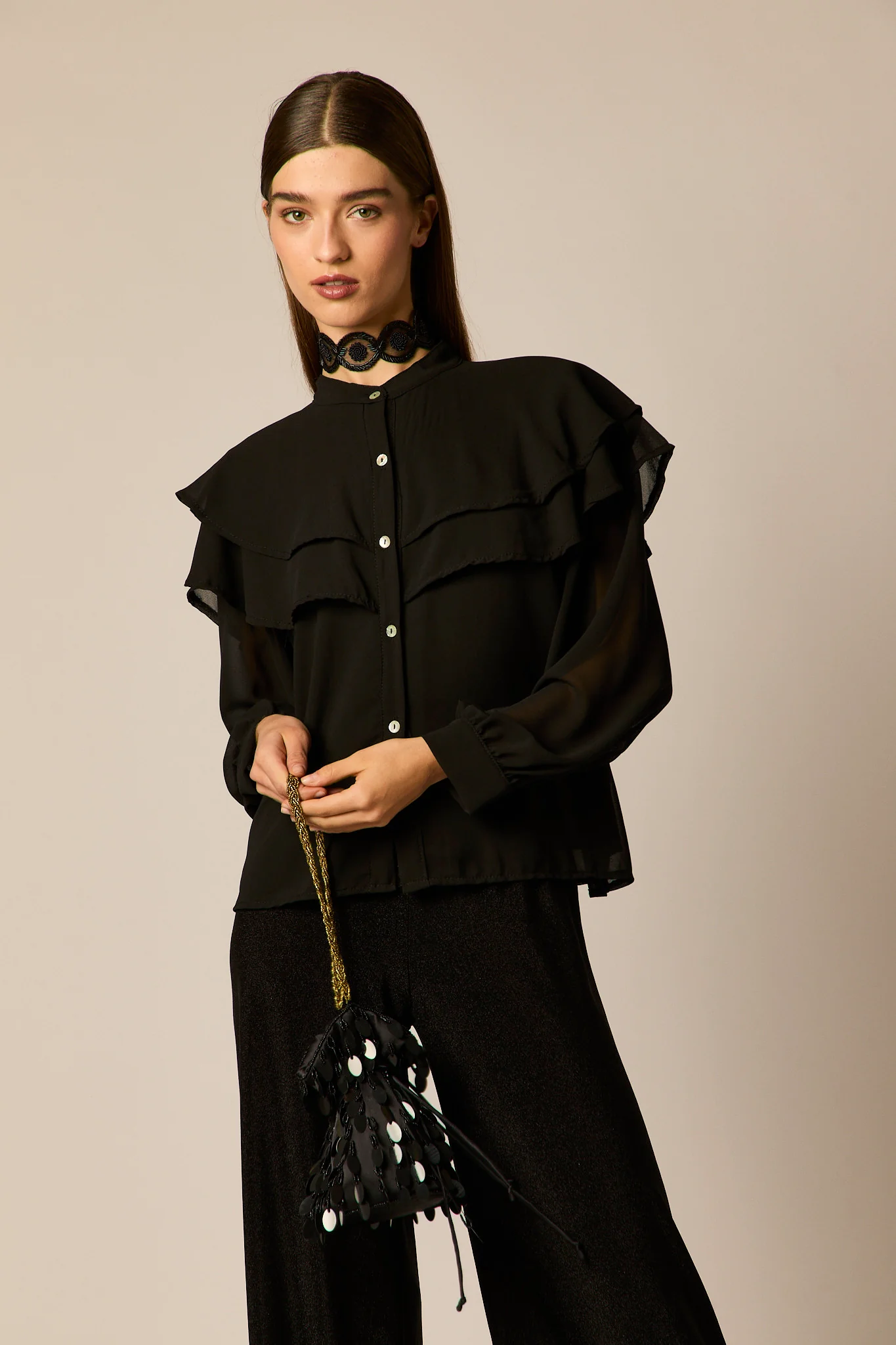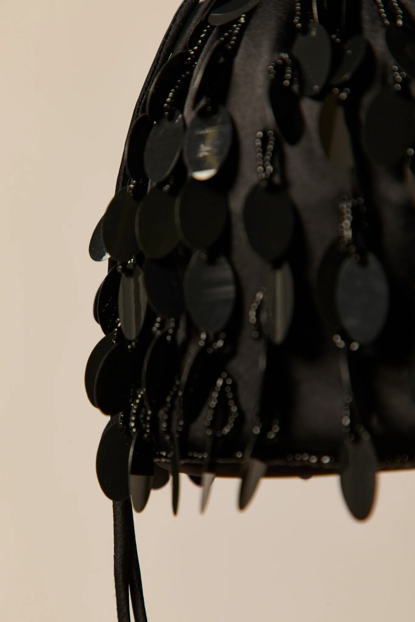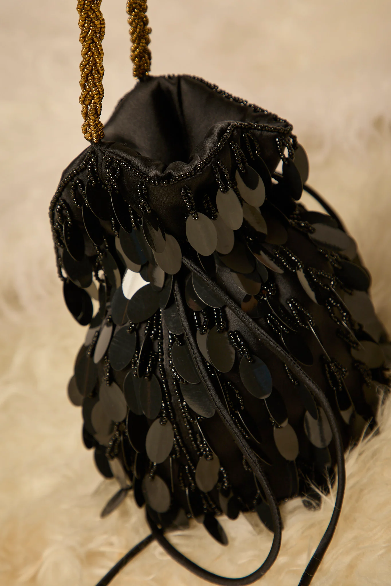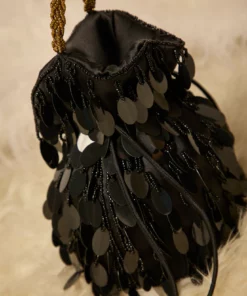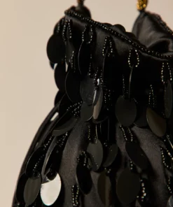 Bolso estilo bombonera en color negro con lentejuelas por todo el diseño. Cadena dorada y cierre de lazo negro.