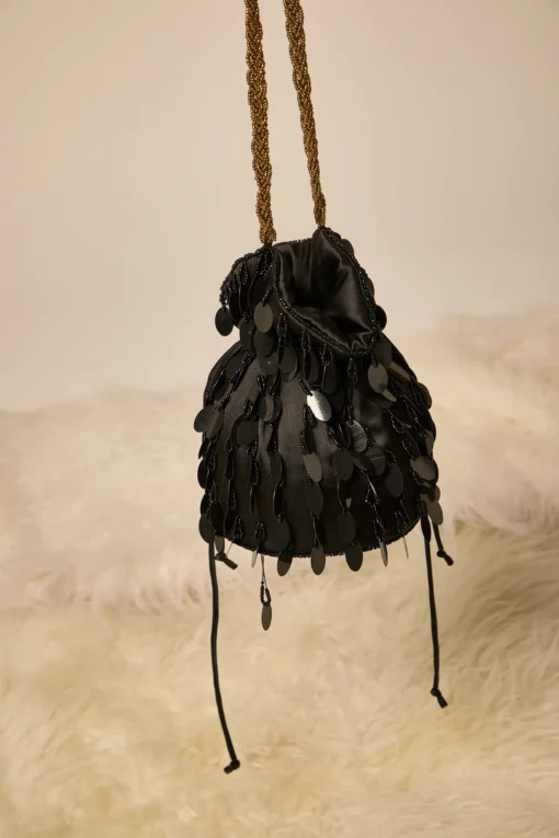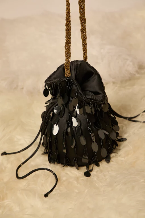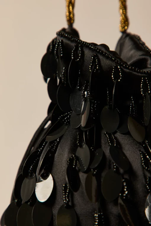 Bolso estilo bombonera en color negro con lentejuelas por todo el diseño. Cadena dorada y cierre de lazo negro.