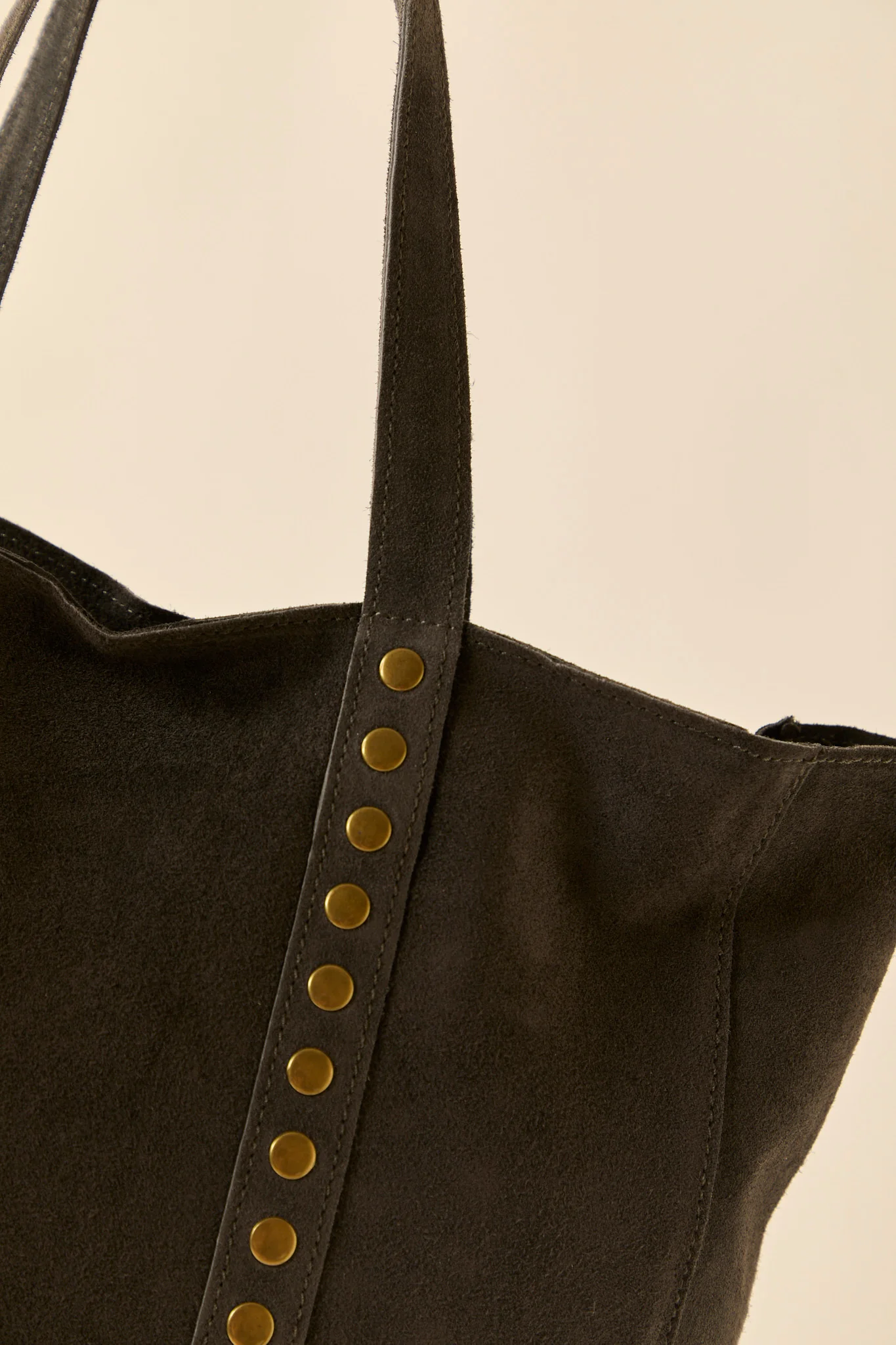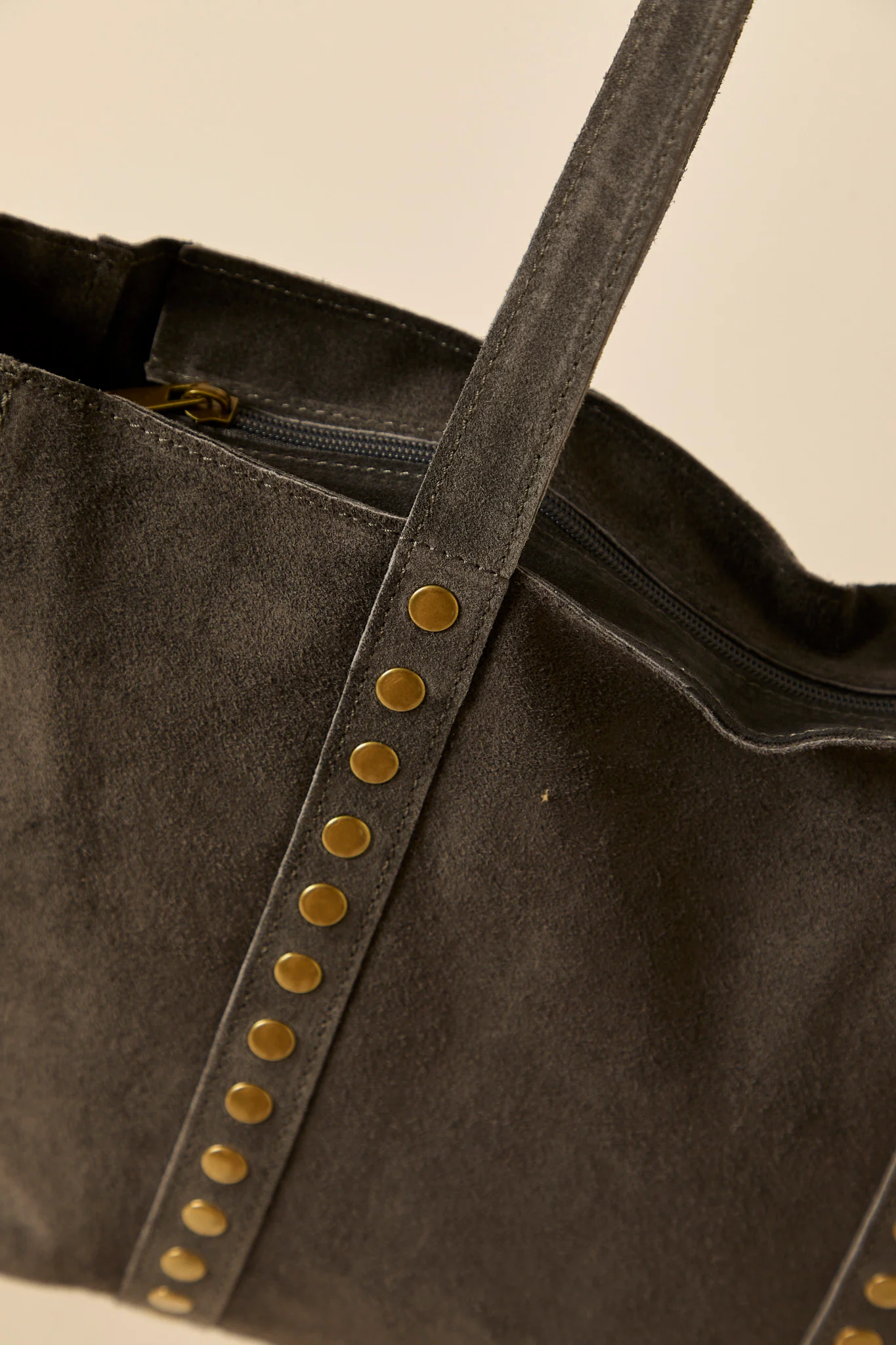 Bolso de ante en color gris antracita con detalle de tachas metálicas y cierre de cremallera. Medidas: 48 cm de largo y 30cm de alto.