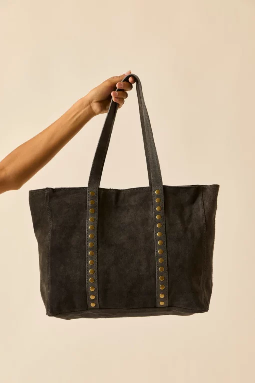 Bolso de ante en color gris antracita con detalle de tachas metálicas y cierre de cremallera. Medidas: 48 cm de largo y 30cm de alto.