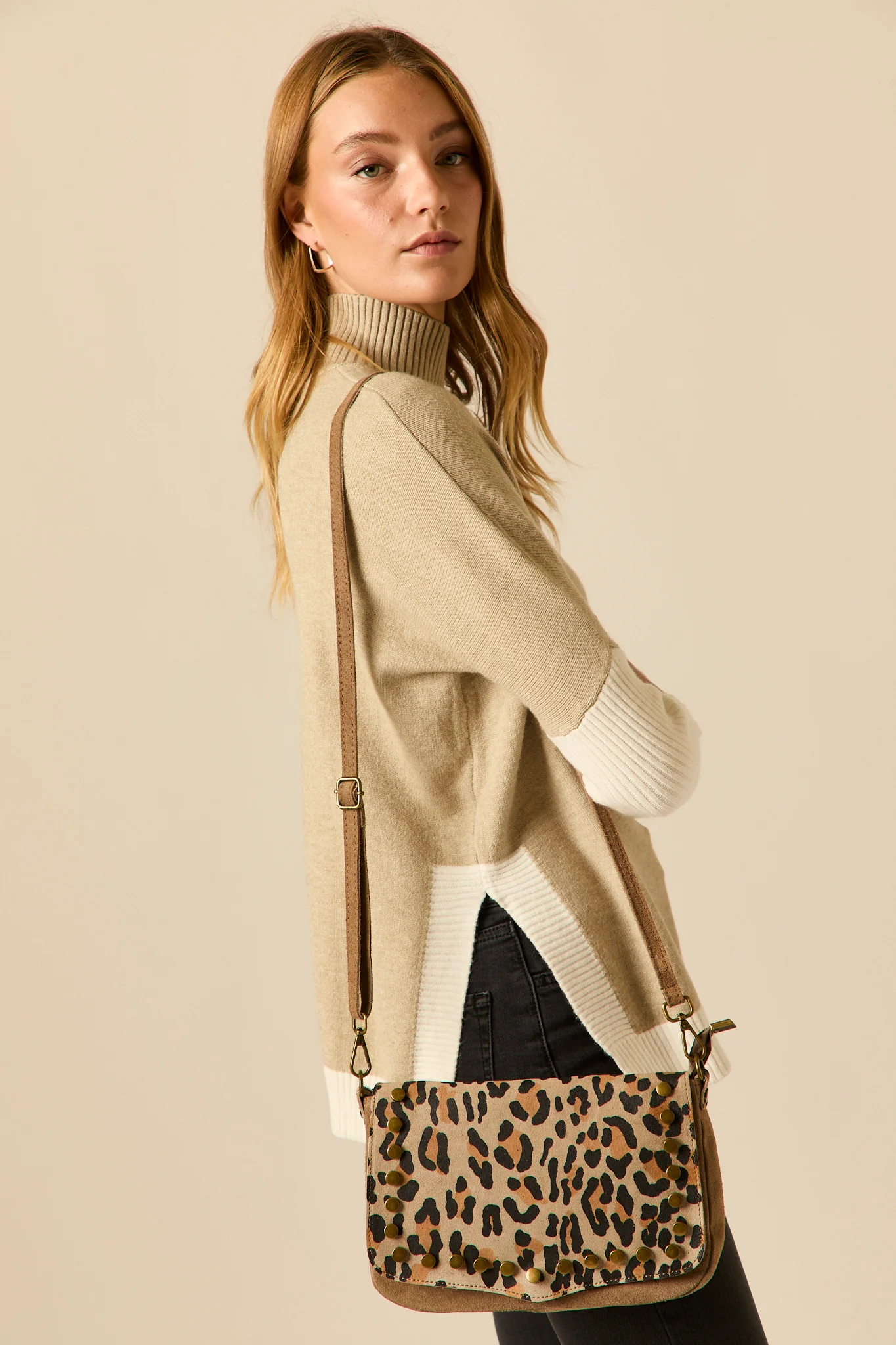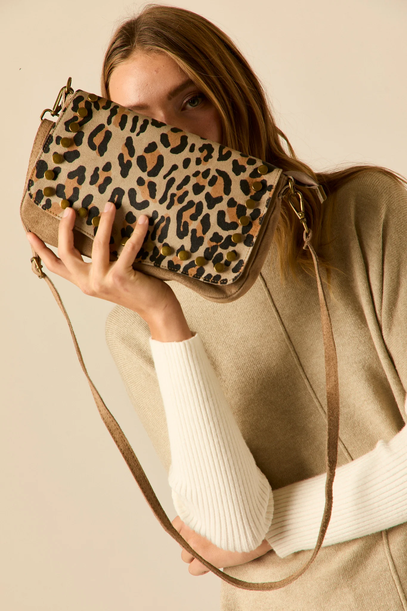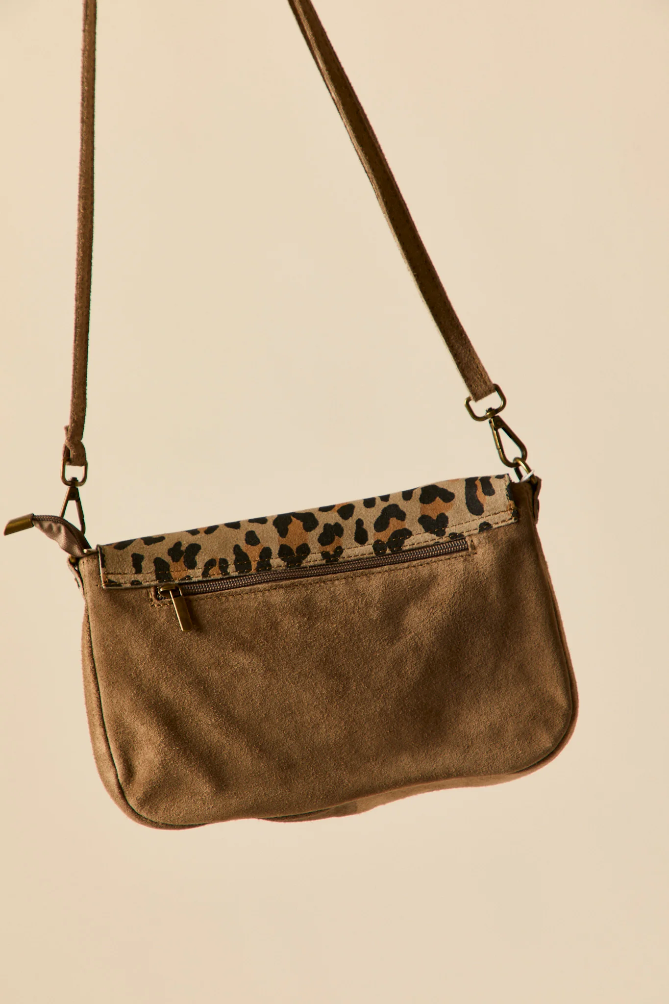 Bolso pequeño en color topo con estampado de animal print. Diseño estilo cartera, cremallera y forro interior.