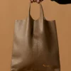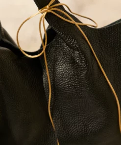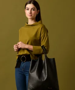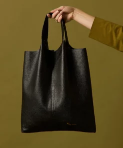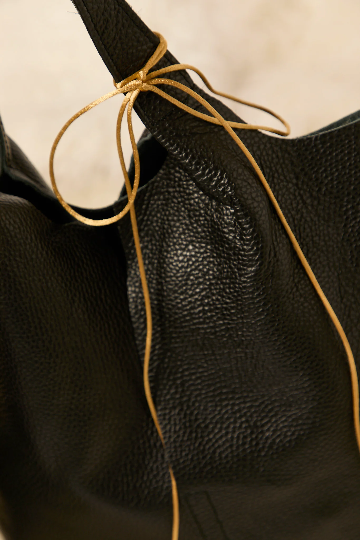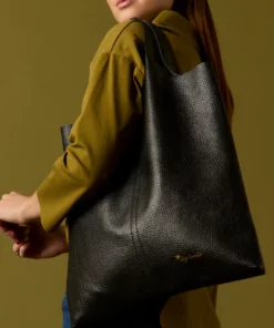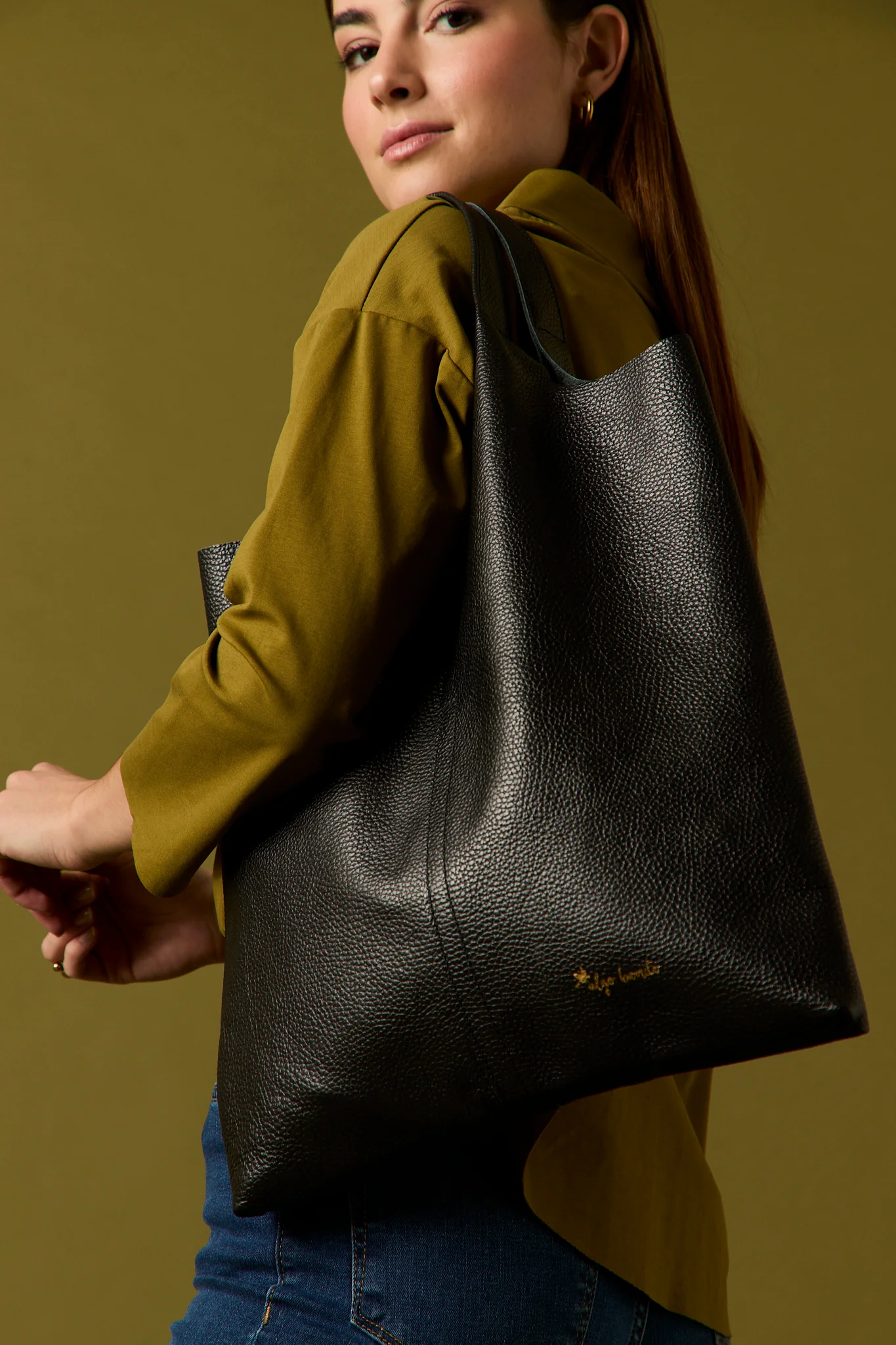 Bolso de piel en color negro. Diseño amplio, asas cortas y aberturas centrales.