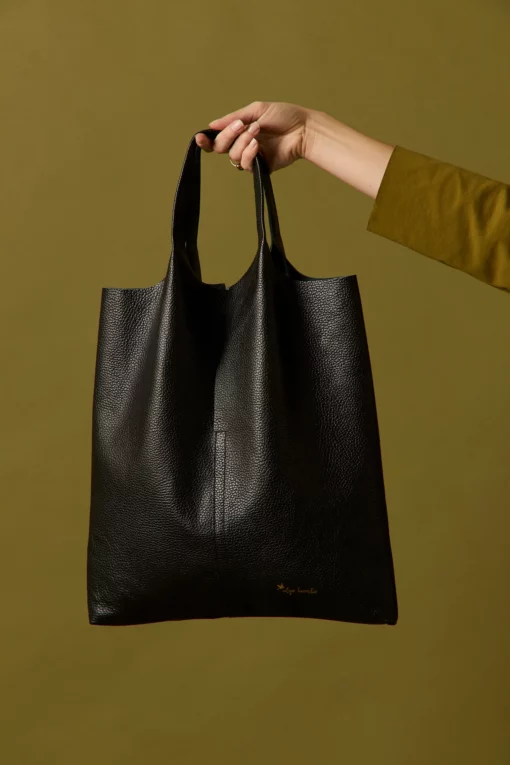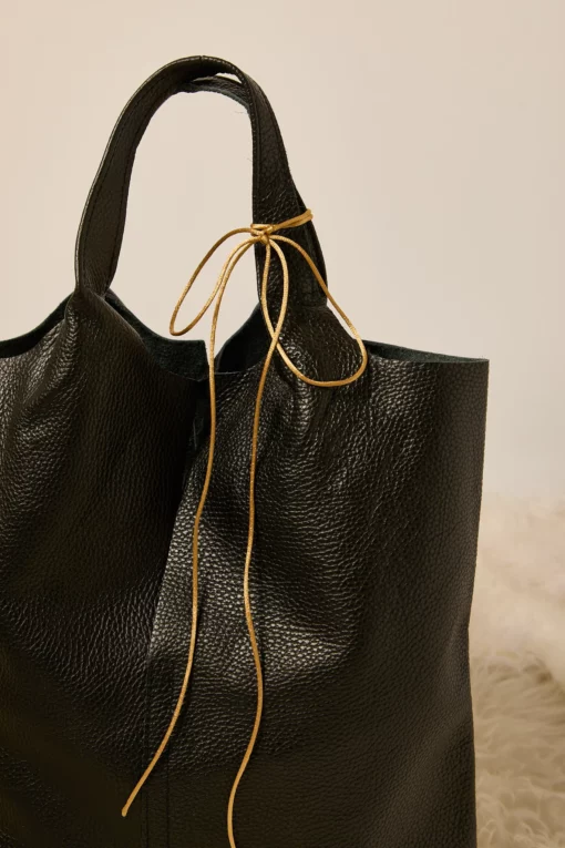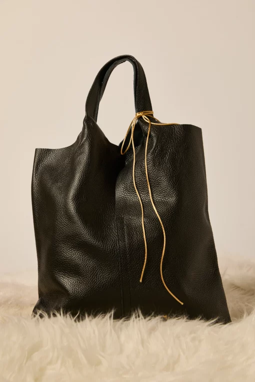 Bolso de piel en color negro. Diseño amplio, asas cortas y aberturas centrales.