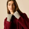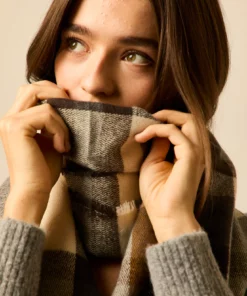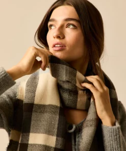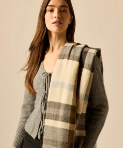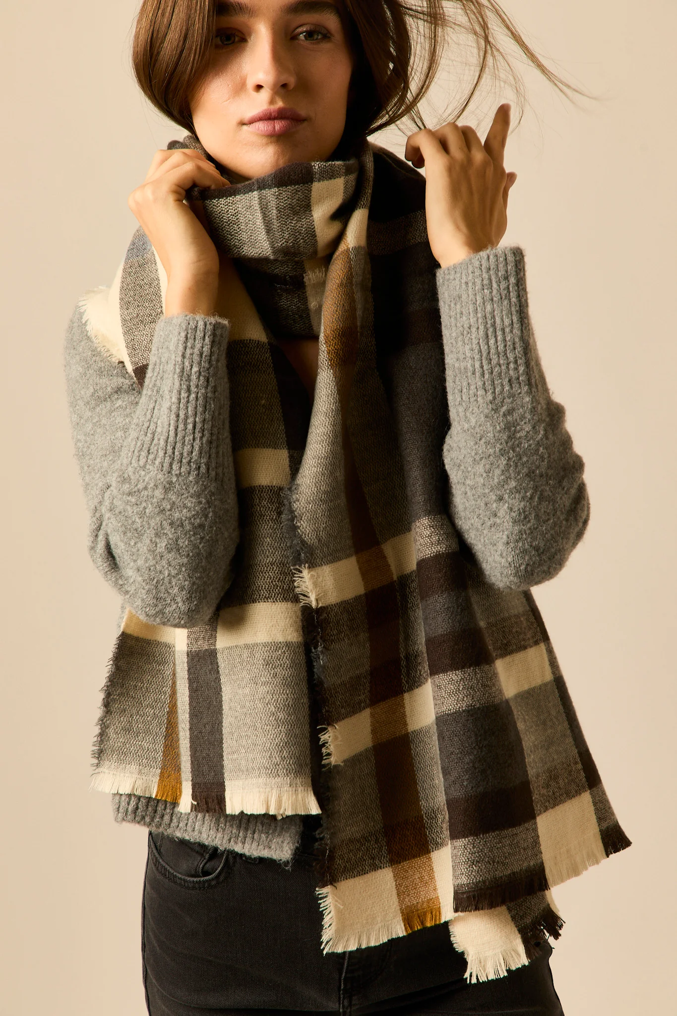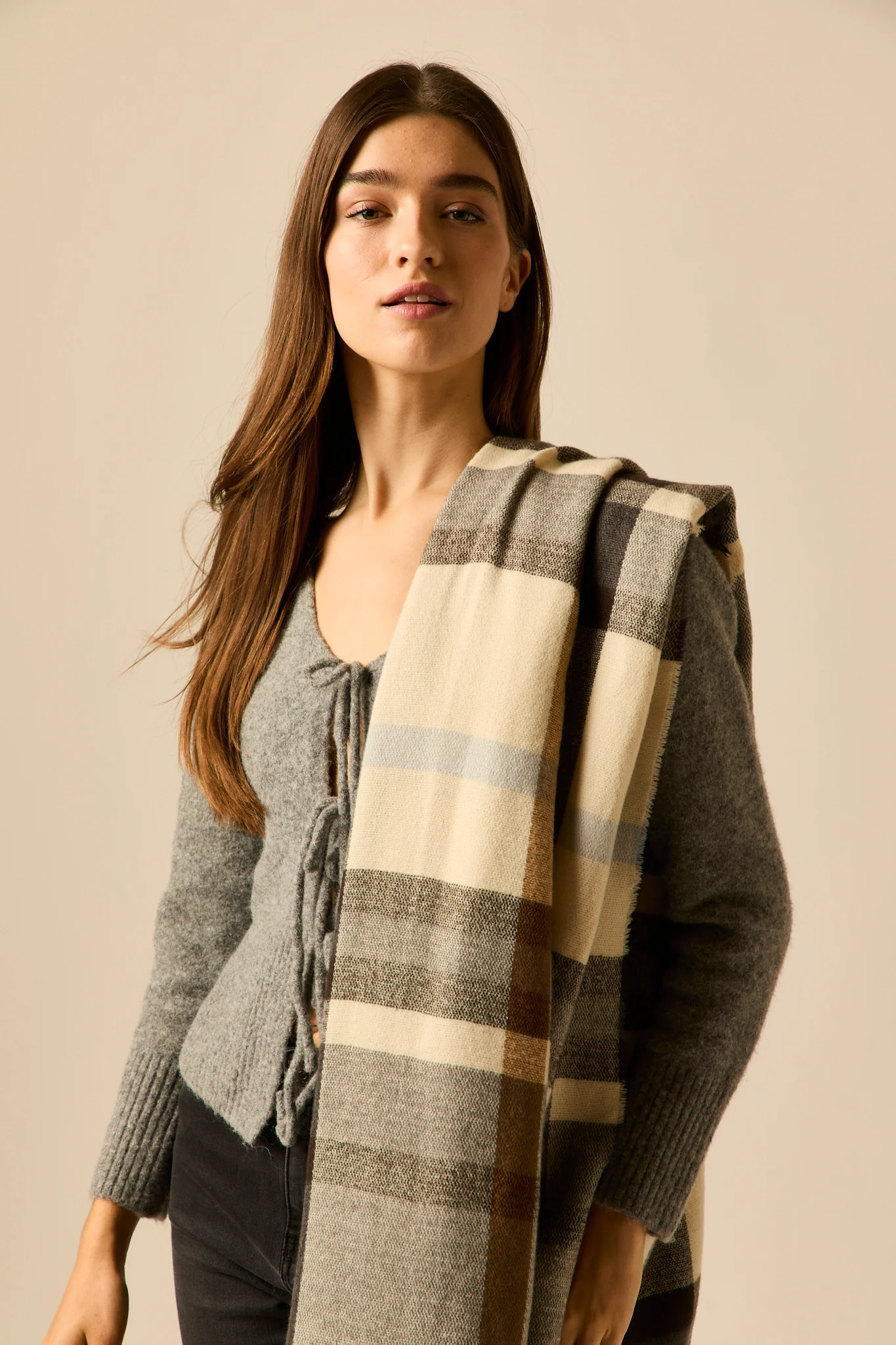 Bufanda jacquard de cuadros estilo manta en tonos crema, gris y marrón con acabados en flecos en ambos extremos.