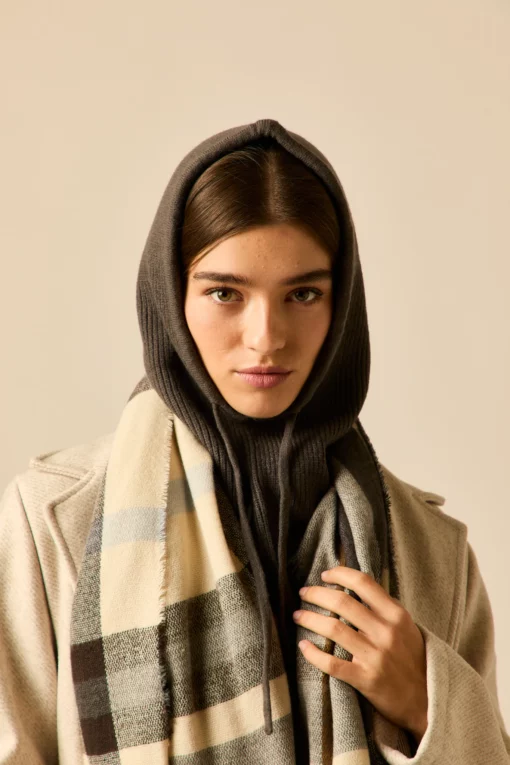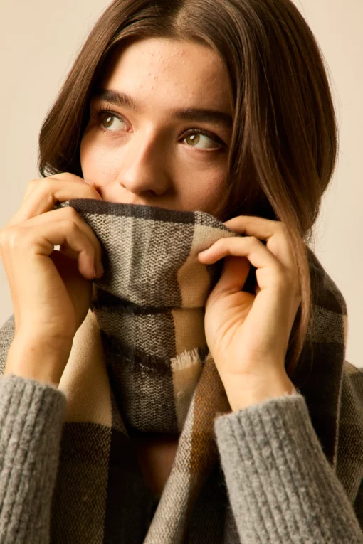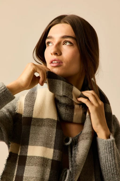Bufanda jacquard de cuadros estilo manta en tonos crema, gris y marrón con acabados en flecos en ambos extremos.