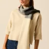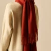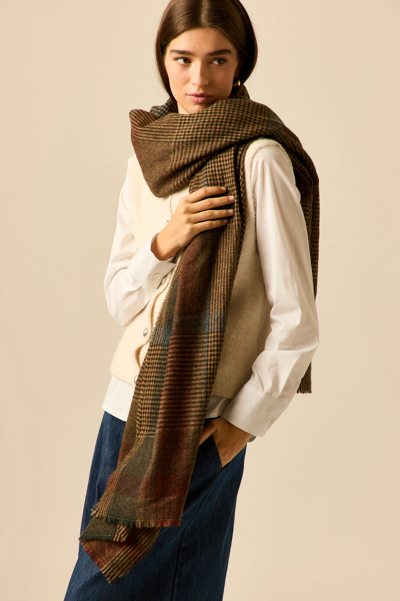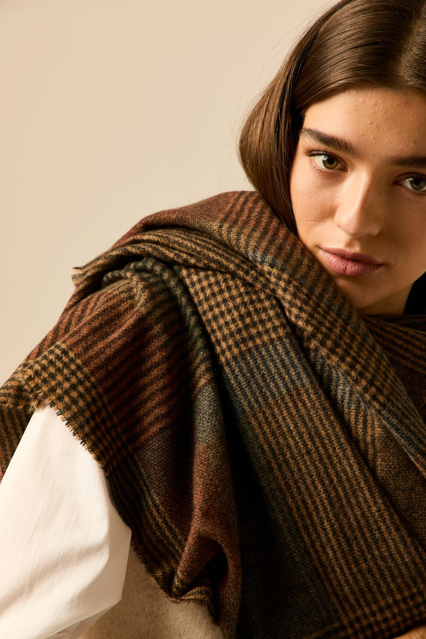 Bufanda jacquard de cuadros estilo manta en tonos marrones con acabados en flecos en ambos extremos.