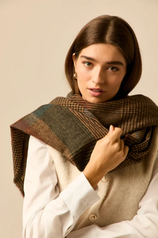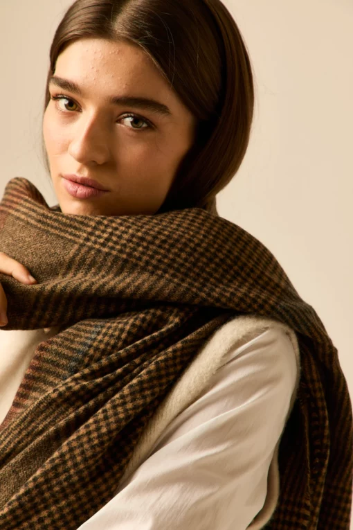 Bufanda jacquard de cuadros estilo manta en tonos marrones con acabados en flecos en ambos extremos.