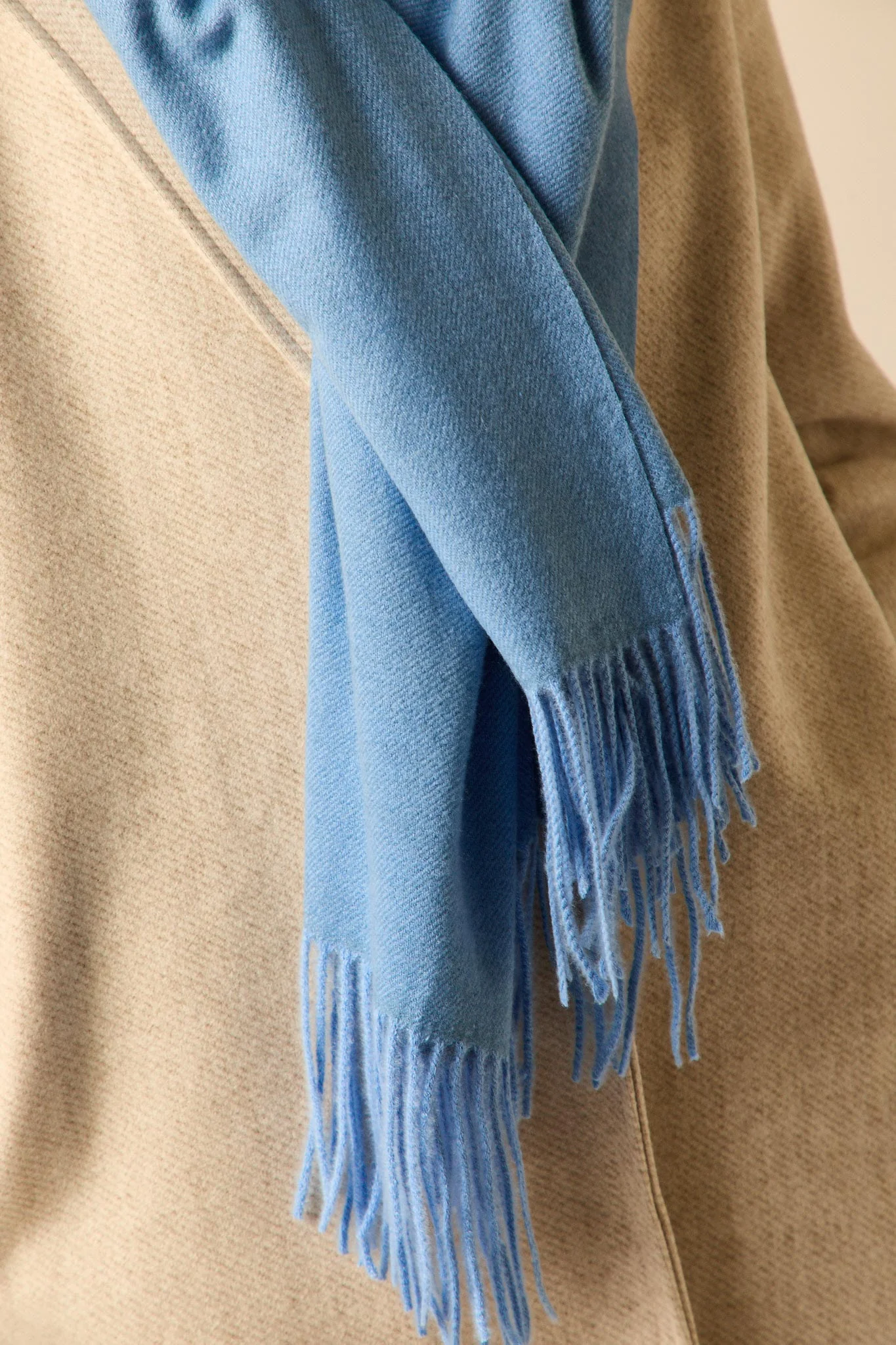 Bufanda estilo manta lisa de color azul celeste con acabados en flecos en ambos extremos.