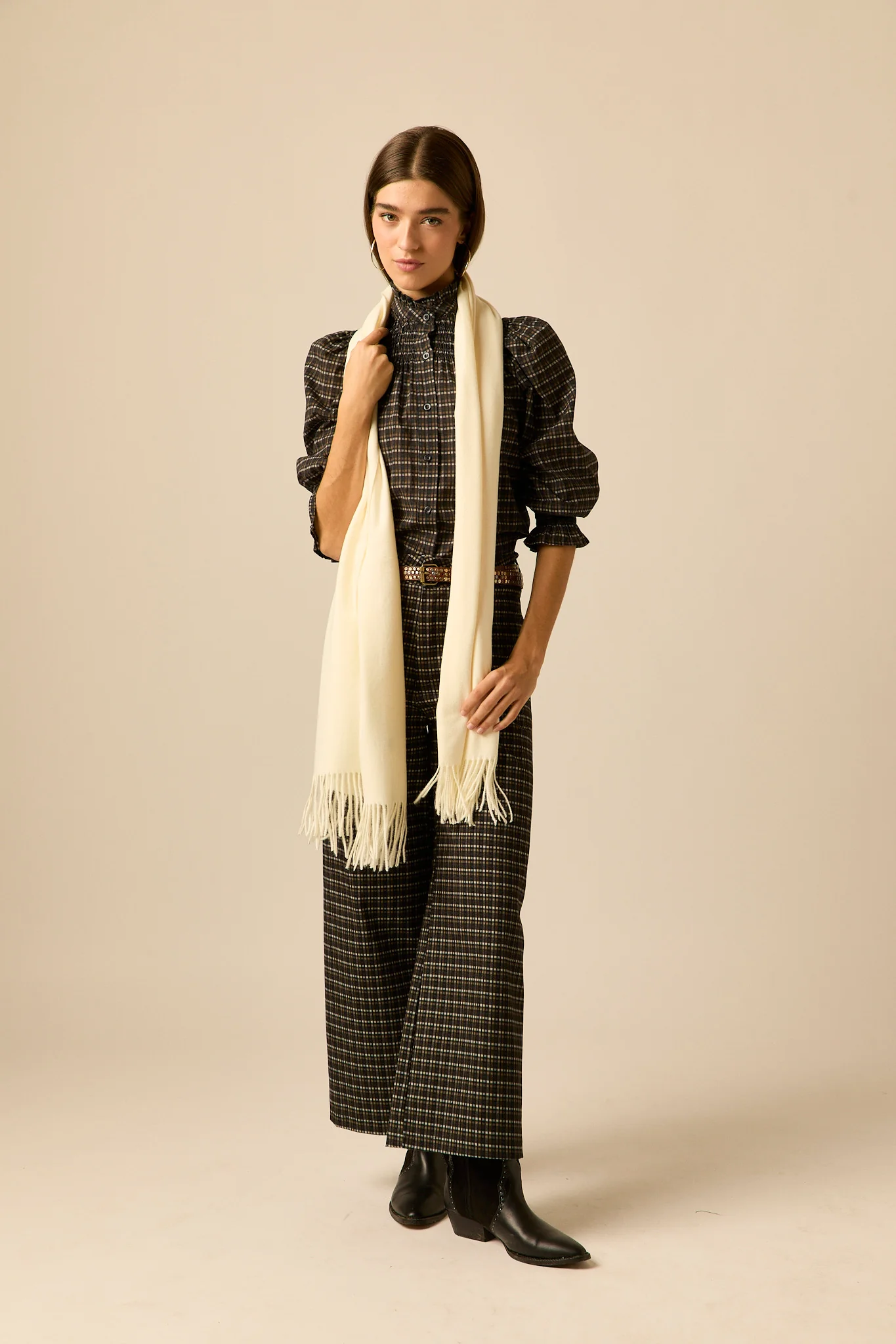 Bufanda estilo manta lisa de color crema con acabados en flecos en ambos extremos.