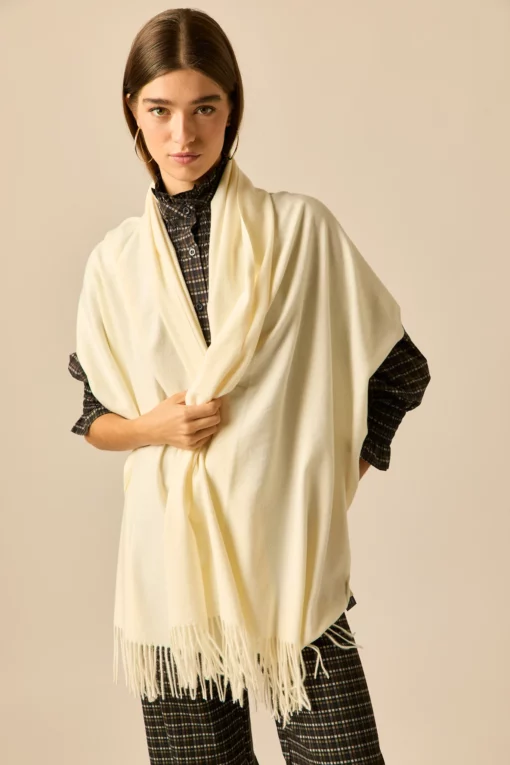Bufanda estilo manta lisa de color crema con acabados en flecos en ambos extremos.