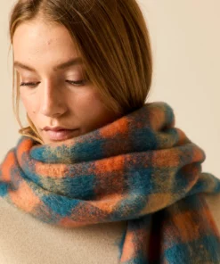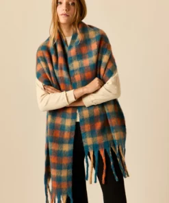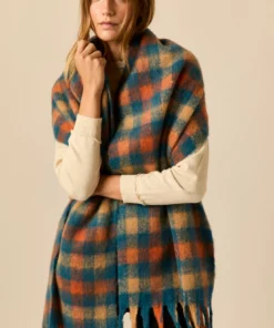 Bufanda manta de cuadros en tonos azul, naranja y amarillo con acabado de flecos.