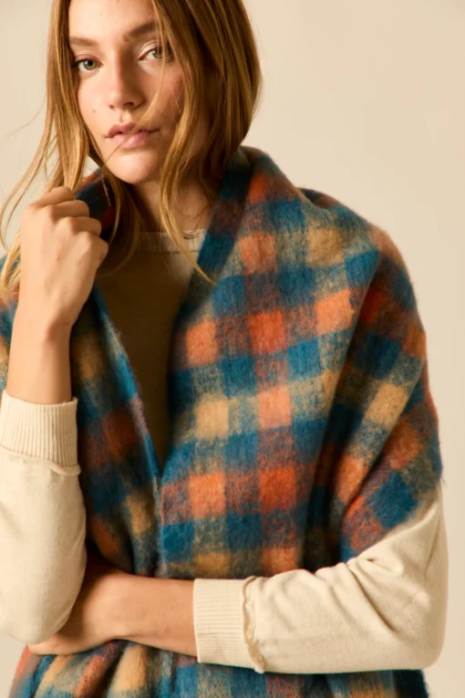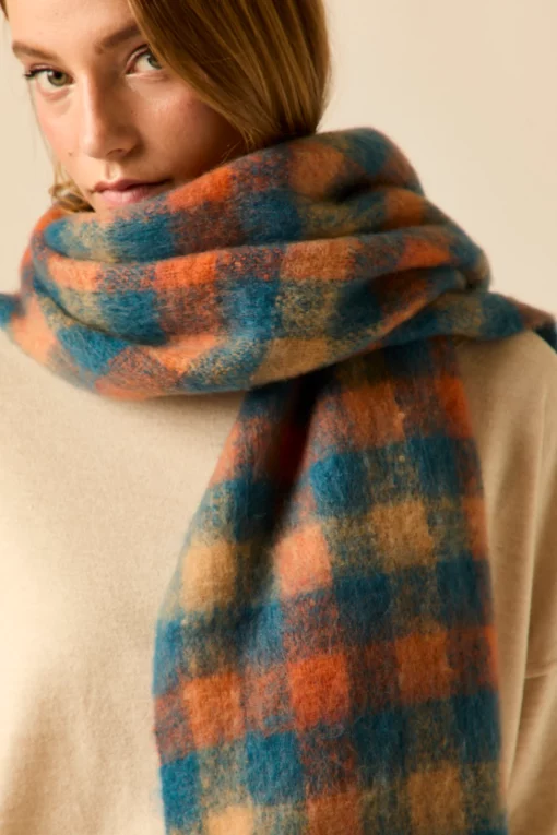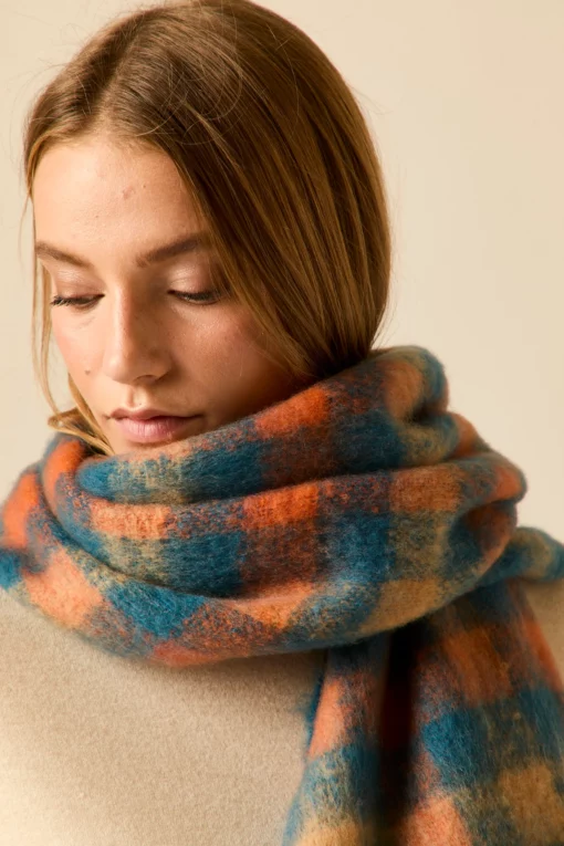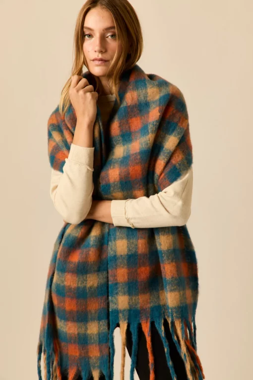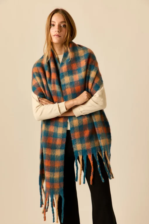 Bufanda manta de cuadros en tonos azul, naranja y amarillo con acabado de flecos.