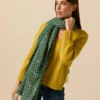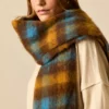 Bufanda de estampado de rombos en tonos gris, blanco y mostaza. Diseño amplio, detalle de flecos en los extremos y tacto suave.