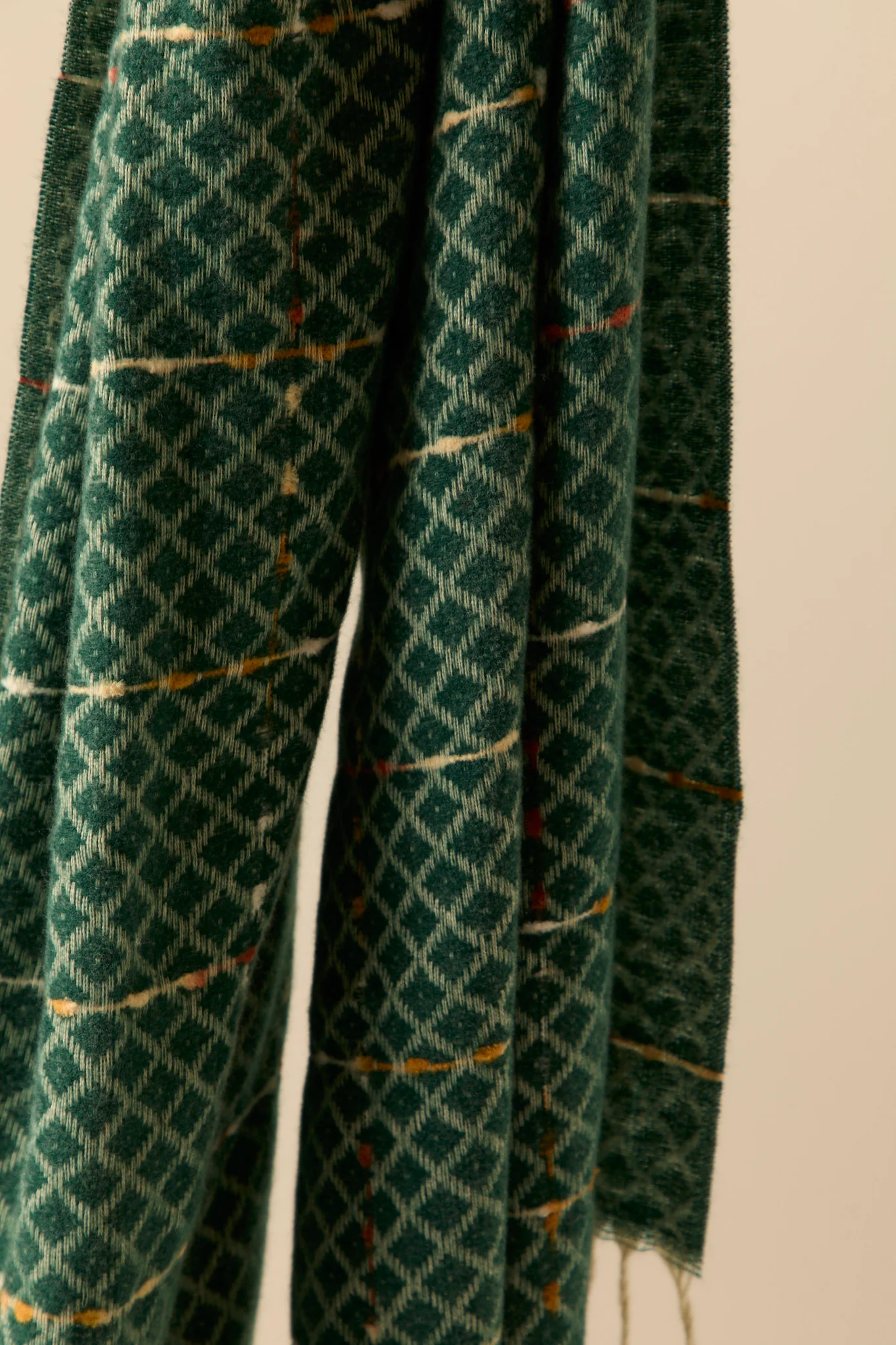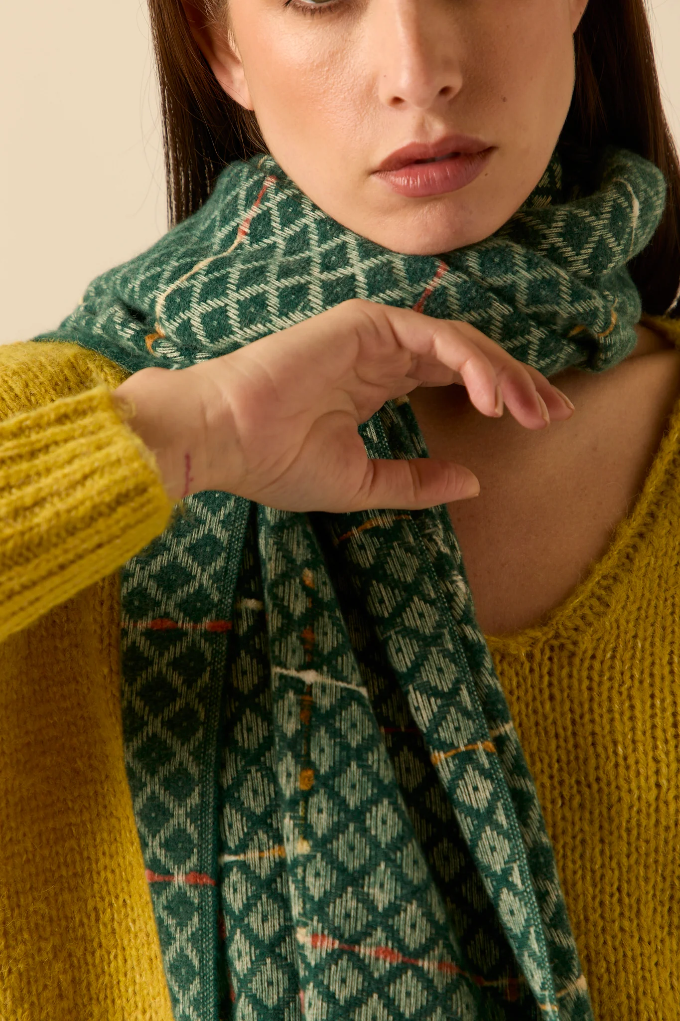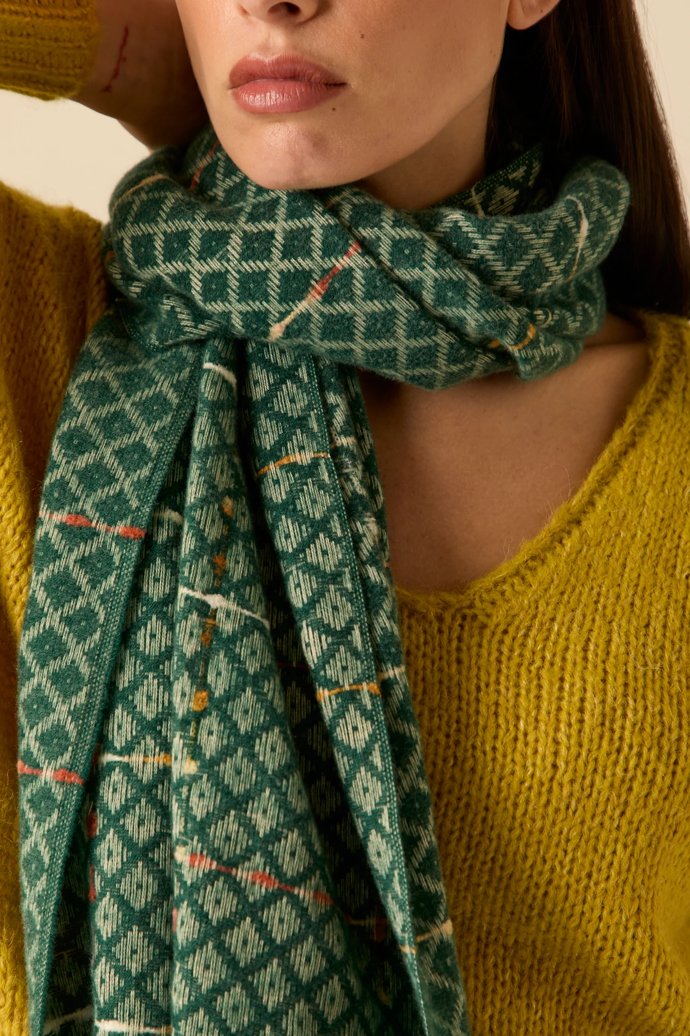 Bufanda de estampado de rombos en tonos verde, blanco y mostaza. Diseño amplio, detalle de flecos en los extremos y tacto suave.