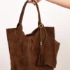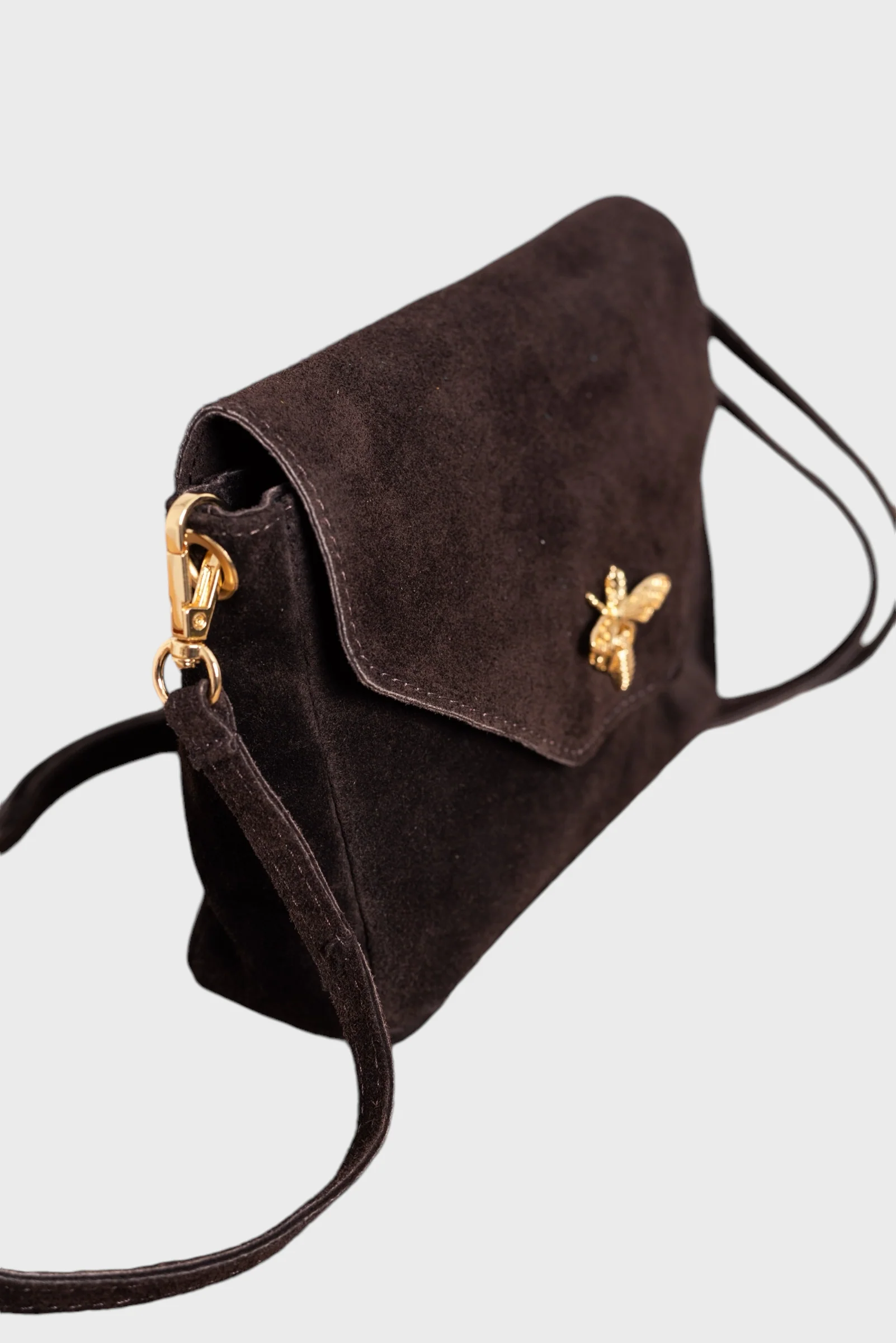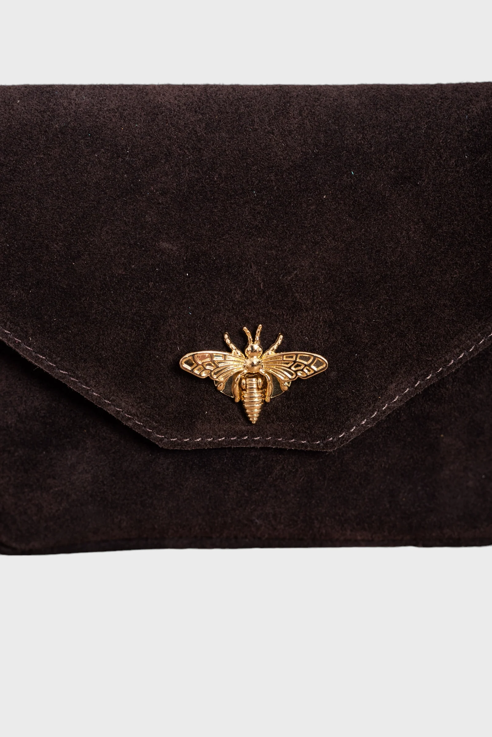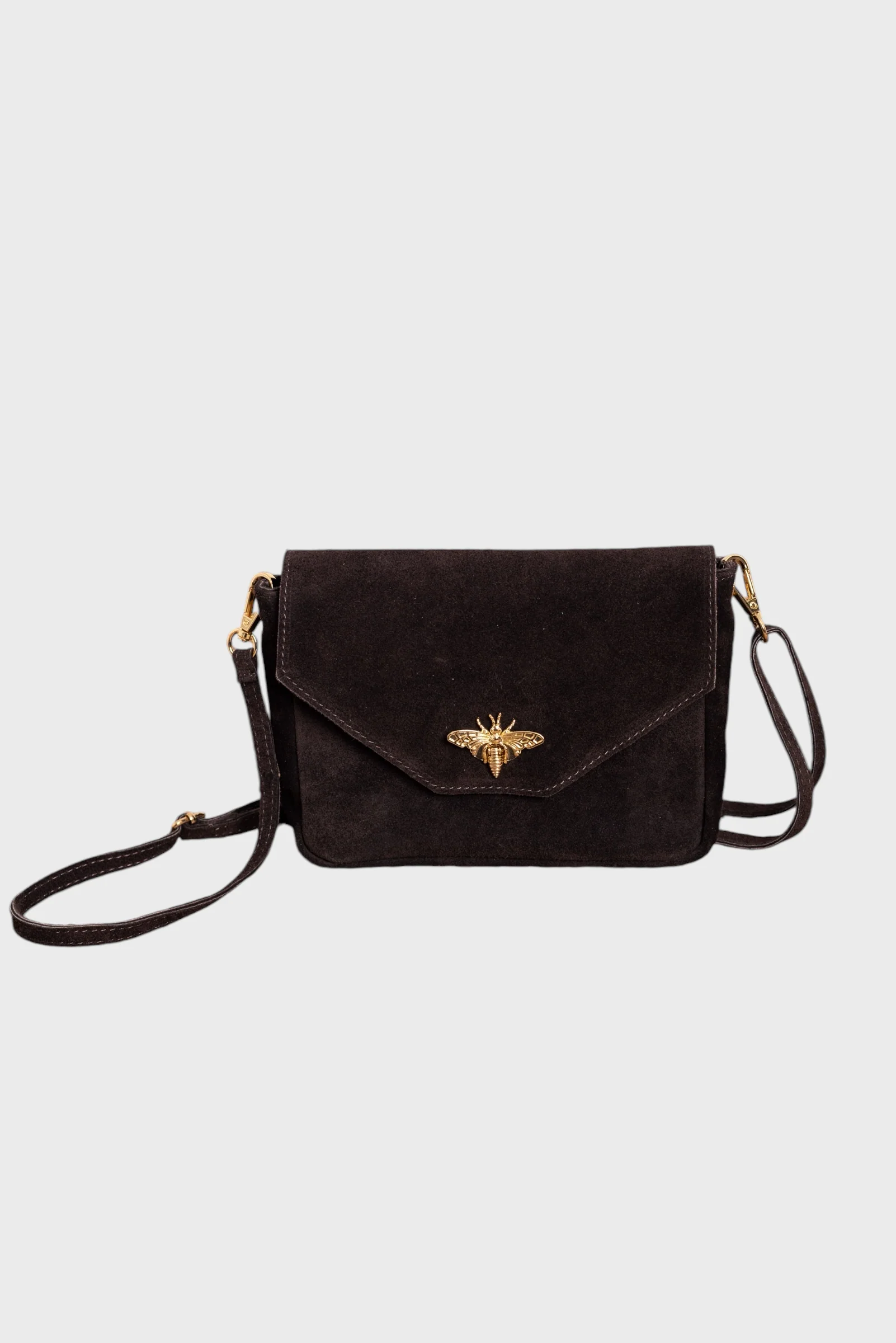 Bolso bandolera de serraje. Cierre con cremallera y solapa. Cierre metalico con forma de abejorro dorado. Ideal en todos los colores.