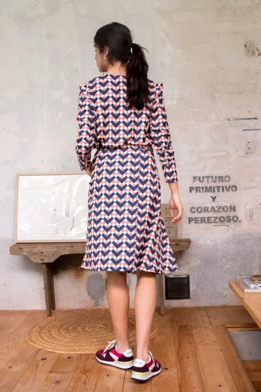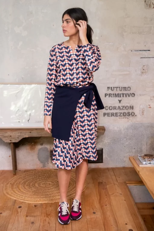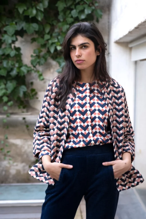 Camisa Cathy realizada en viscosa con dibujo geométrico, en tonos crudo, azul y rosa palo, con caída y movimiento.
