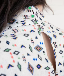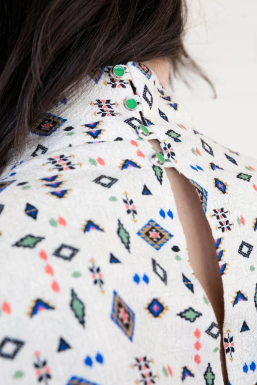 – Cuello con lazada y botonadura en la parte de atrás con botón de fantasía.
